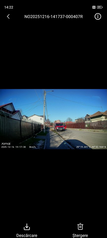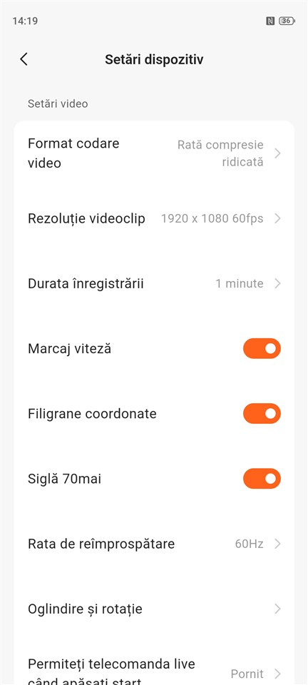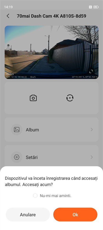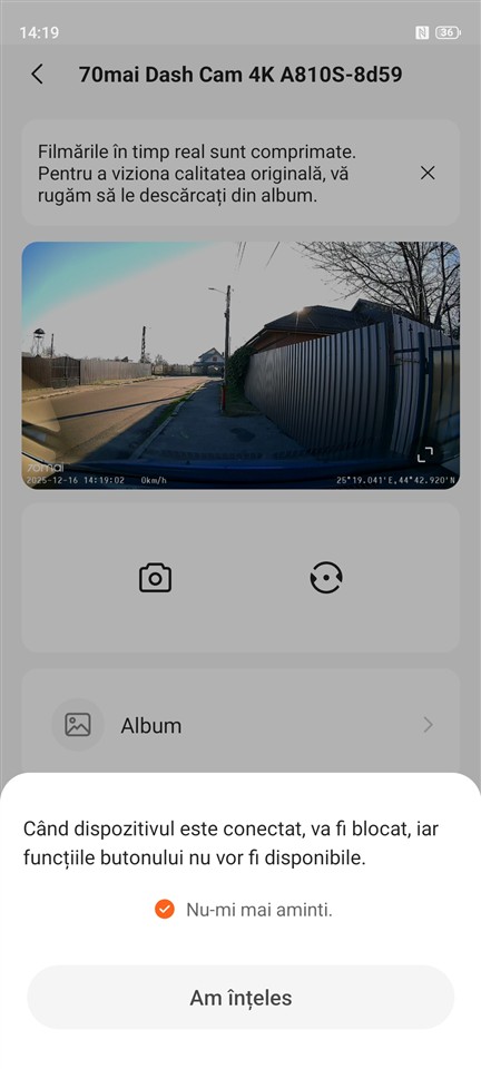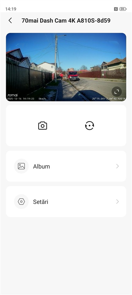 Aparte de meniul cu setări disponibil direct din cameră, mai poți face aceleași ajustări și din aplicația 70mai, disponibilă gratuit atât în Google Play Store, cât și în Apple App Store. Nu doar că ai la dispoziție toate setările camerei, dar poți vedea live ce filmează camera, cât și accesa conținutul de pe cardul microSD din cameră. Acest conținut poate fi descărcat rapid pe smartphone, la nevoie.