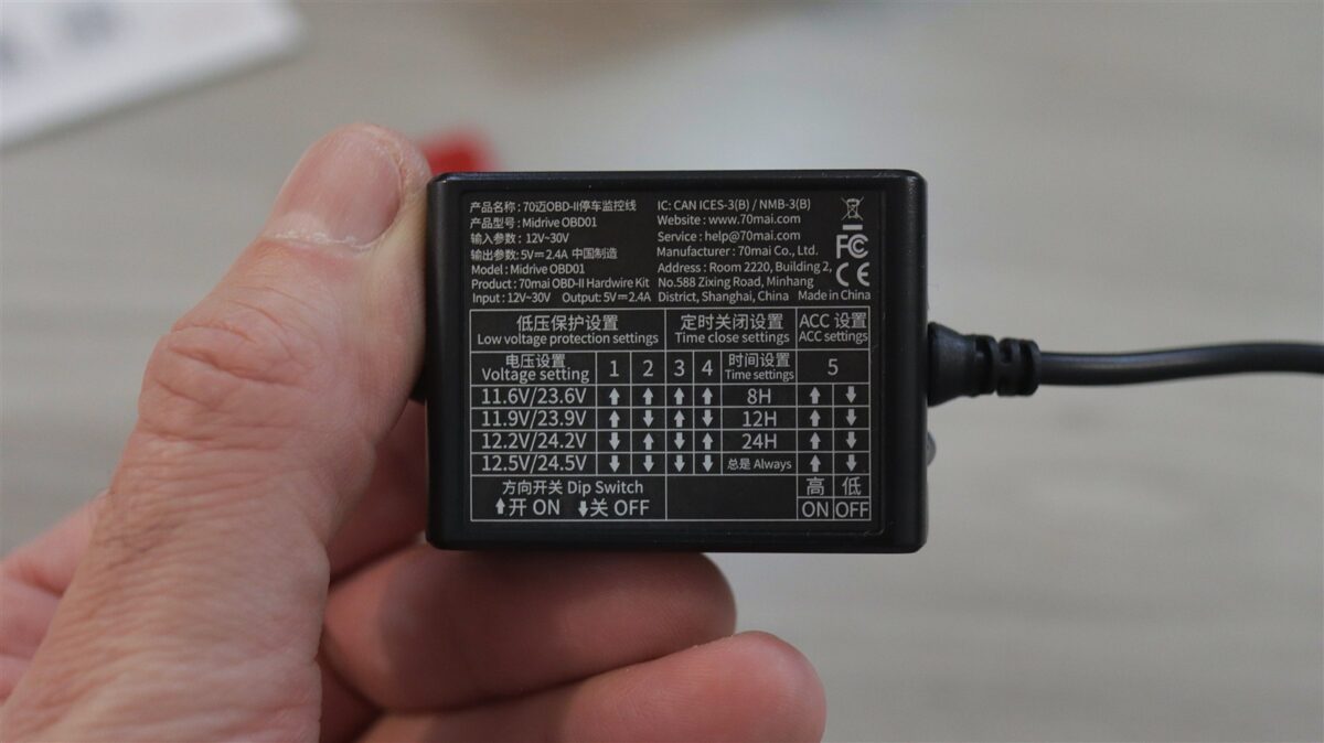 Așa cum am menționat, aparte de pachetul 70mai A810S am mai primit kit-ul 70mai OBD-II Hardwire kit, care permite alimentarea camerei nu prin priza de 12V a mașinii, care va „tăia” curentul imediat ce este oprit motorul. Kit-ul de alimentare prin portul OBD-II al mașinii permite activarea modului de monitorizare continuă la staționare. Dispozitivul se conectează la portul OBD-II și permite setarea mai multor parametrii prin modulul separat. Prin mutarea a cinci butoane de tip switch poți alege care să fie tensiunea minimă a materiei autovehiculului până la care camera 70mai A810S să fie alimentată. Este o protecție la descărcarea bateriei mașinii sub un anumit prag al tensiunii, pe care îl poți seta rapid și ușor.