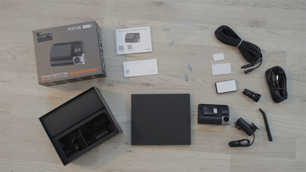 În cutia 70mai A810S am găsit camera frontală, camera spate, cablul ce face legătura între cele două, cablul USB-A la USB-C necesar alimentării camerei frontale, adaptorul de alimentare pentru priza de 12V a mașinii, unul cu două ieșiri USB-A, o micuță „unealtă” de care te poți ajuta spre a introduce cablurile în spatele ornamentelor din mașină, pad-ul pentru lipirea camerei frontale pe parbriz, două stickere dublu adezive suplimentare (câte unul pentru fiecare cameră), două seturi de folie electrostatică (pentru lipirea indirectă pe parbriz / lunetă a camerelor) și câte un manual de utilizare pentru fiecare cameră.