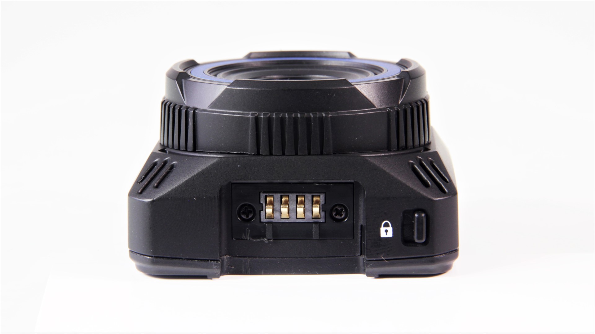 Există un port miniUSB și pe cameră, dar acesta este doar pentru a realiza conexiunea cu un PC, prin intermediul cablului de date din pachet. Așadar, nu poți folosi un alt suport în afara celui din cutia de retail. Acesta este prevăzut cu un ”picioruș” reglabil, ce-ți permite ajustarea unghiului de vizualizare. Pe cameră este și un buton ce blochează, securizează, modul de îmbinare dintre suport și cameră.