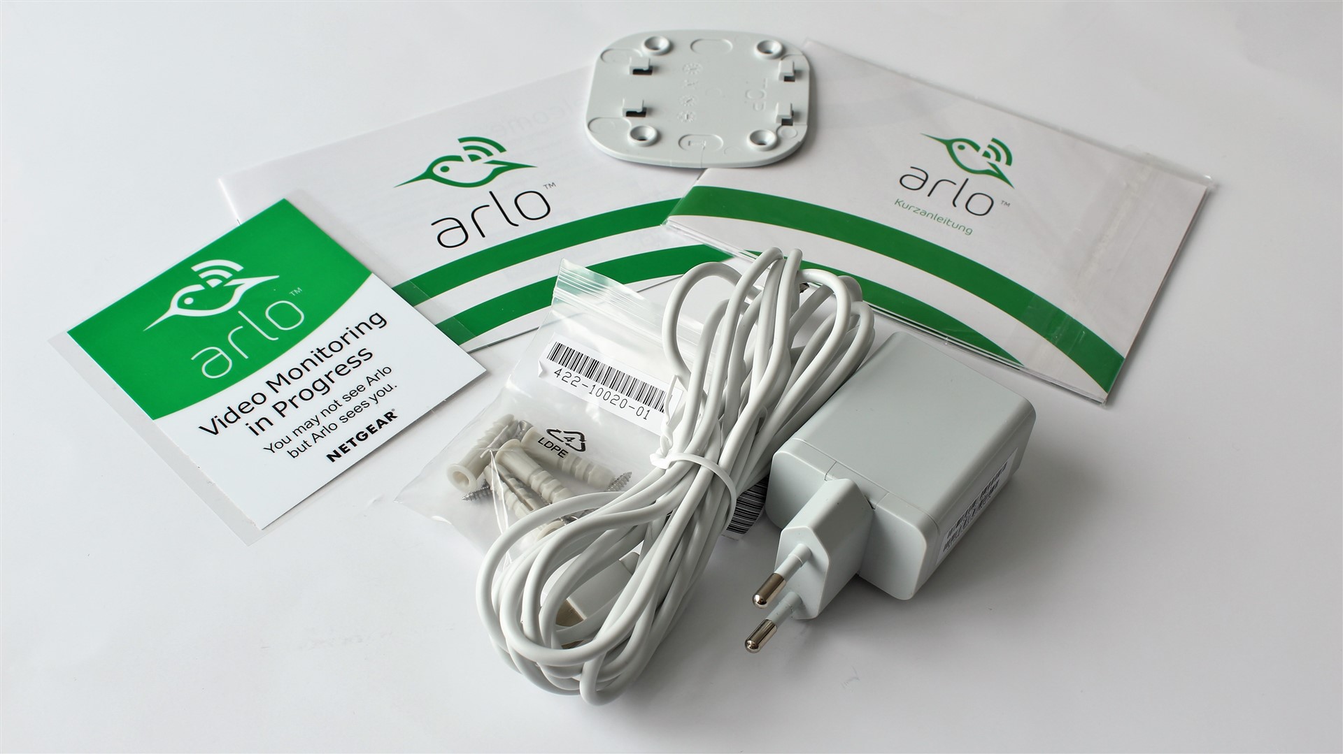 Cutia în care vine camera de supraveghere NETGEAR Arlo Q mai conține și cablul de alimentare microUSB – USB lung de circa 3 metri, alimentator pe USB, suport pentru prins pe perete, 4 dibluri cu 4 șuruburi, manual de utilizare, certificat de garanție și sticker de informare asupra zonei monitorizate.