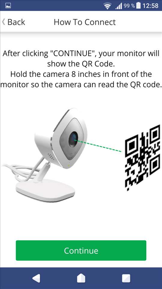 Apoi apeși continuu (circa 3 secunde) pe butonul Sync de pe camera NETGERA Arlo Q până când ledul de notificare se aprinde intermitent în culoarea albastru. Când ledul se aprinde în acest fel, apeși în aplicație pe butonul Continue și imediat ți se va afișa pe ecranul telefonului un cod QR.