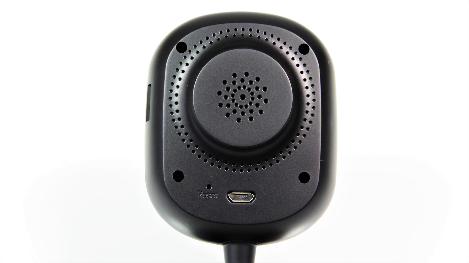 Pe partea spate vedem grila difuzorului integrat, portul microUSB ce permite alimentarea cu energie electrică a dispozitivului și butonul Reset, ce poate fi apăsat doar cu ajutorul agrafei din pachet.