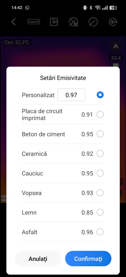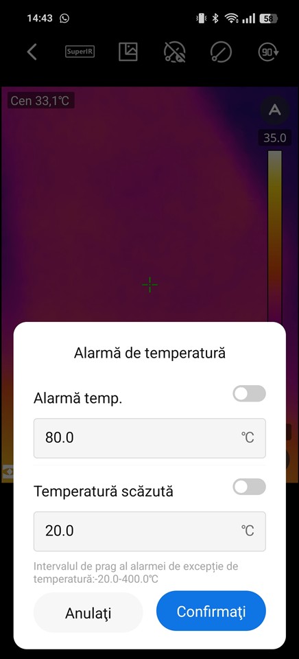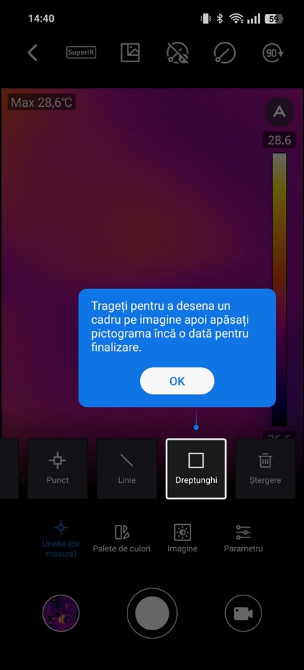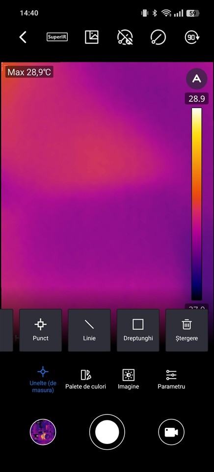 Ca domenii de măsurare a temperaturilor, avem datele în tabelul cu specificații de la începutul recenziei, eu aici mai vreau să amintesc că sunt multiple moduri în care temperaturile din cadru pot fi afișate. Poți alege punct central de măsurare, poți adăuga și cel mai fierbinte sau cel mai scăzut punct ca temperatură, poți desena o linie pe care vor fi determinate din nou cel mai fierbinte și cel mai rece punct și chiar desena un dreptunghi în care, la fel, să fie determinate punctele cel mai fierbinte, respectiv cel mai rece. Pentru fiecare punct, căci le poți adăuga pe toate în același timp, în același cadru, este afișată temperatura exactă, la nivel de o zecimală după virgulă.