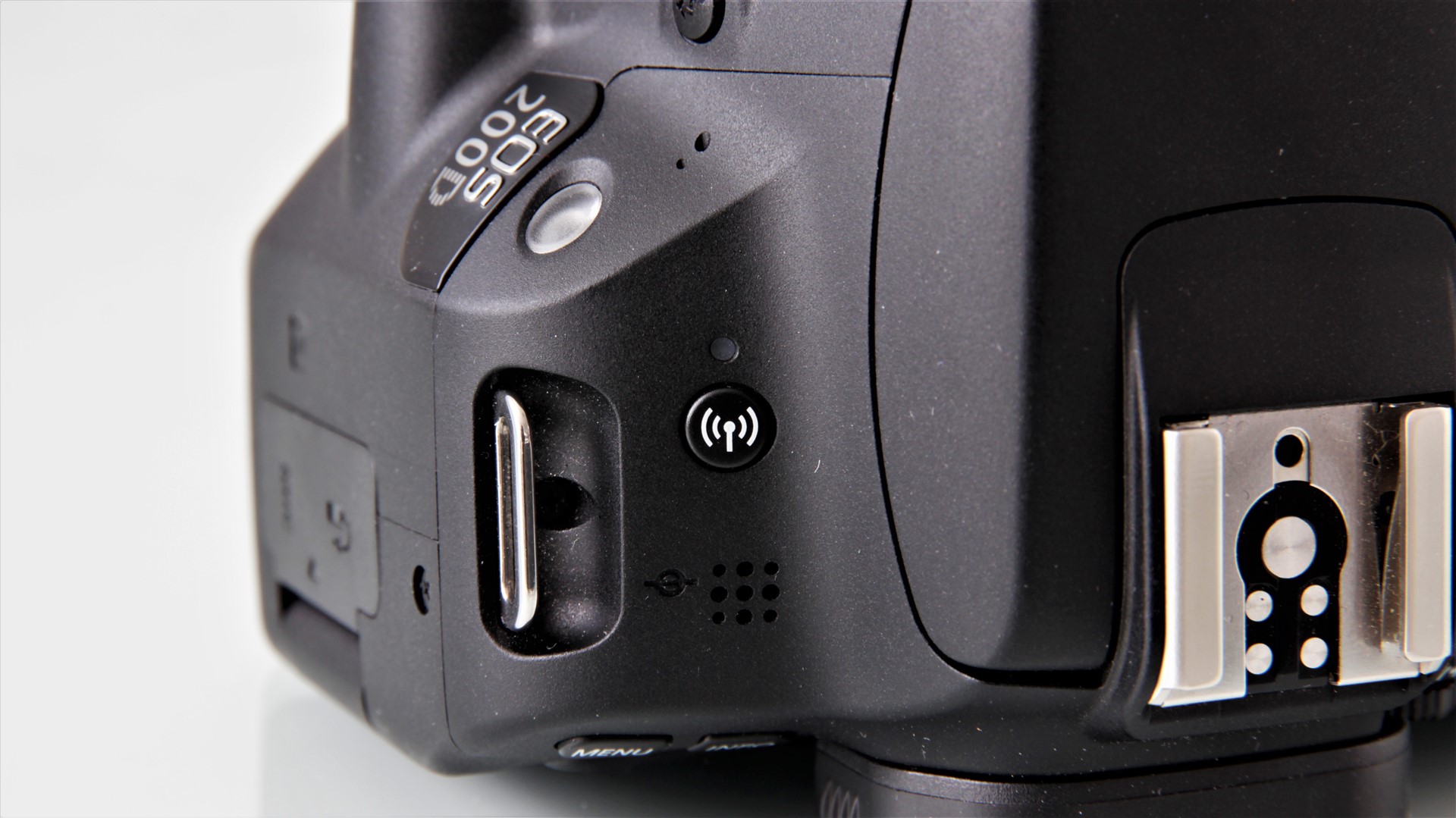 Pe partea de conectivitate prin fir, Canon EOS 200D oferă mini-HDMI compatibilă HDMI-CEC, port miniUSB pentru conexiune cu computerul, jack de 3.5mm pentru microfon extern. Lângă acesta din urmă este și mufa proprietară Canon pentru telecomandă cu fir pentru declanșare obturator.
