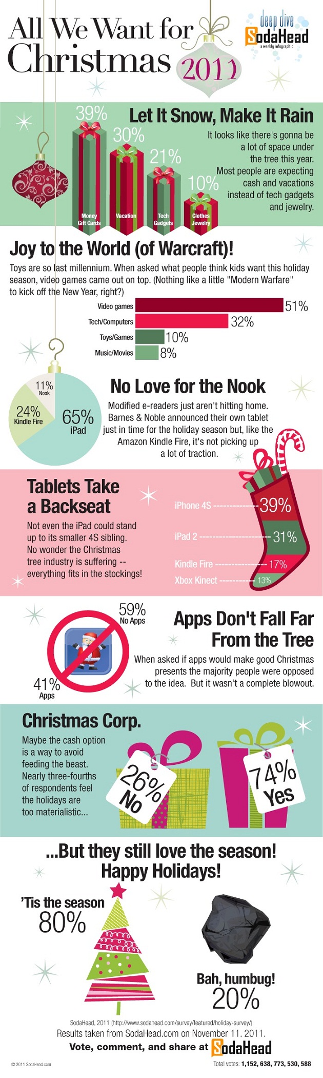 Crăciunul se apropie cu pași repezi și s-a făcut și primul sondaj despre ce-și dorește lumea cadou. Sondajul a fost efectuat pe 1200 de persoane din America și a fost realizat de SodaHead. După bani și vacanțe, cele mai dorite sunt gadgeturile, iar cel mai dorit dintre ele e iPhone 4S. iPad 2, Kindle Fire și Xbox Kinect sunt și ele în top.