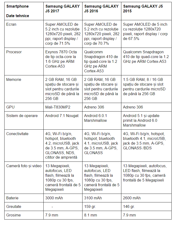 Specificații Samsung GALAXY J5 2017 vs GALAXY J5 2016 și GALAXY J5 2015;