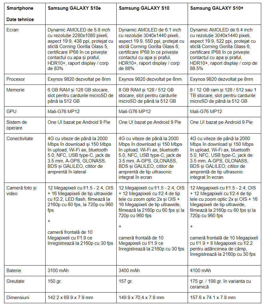 Samsung și-a propus să vină cu o ofertă completă care să-i mulțumească și pe cei mai pretențioși. Samsung GALAXY S10e îl văd drept excelent pentru cei ce caută un smartphone premium cu dimensiuni compacte, S10 și S10 Plus joacă în liga premium în ce privește experiența de utilizare, hardware-ul încorporat, camera foto și video etc.