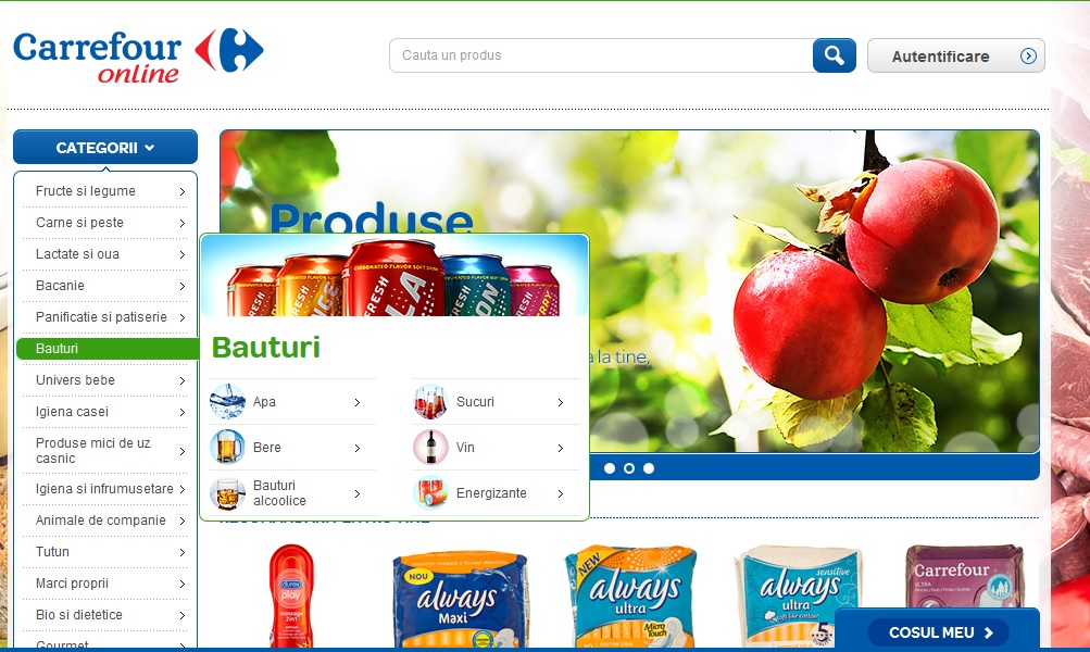 De câteva zile o nouă surpriză a apărut în peisajul comerţului online şi anume Carrefour România. Compania franceză a lansat noul carrefour-online.ro, site prin intermediul căruia poţi cumpăra mai toate produsele de care ai nevoie, urmând ca acestea să îţi fie aduse acasă prin intermediul curierului. Site-ul este momentan în versiunea Beta şi este posibil să aveţi unele probleme în timpul utilizării acestuia.