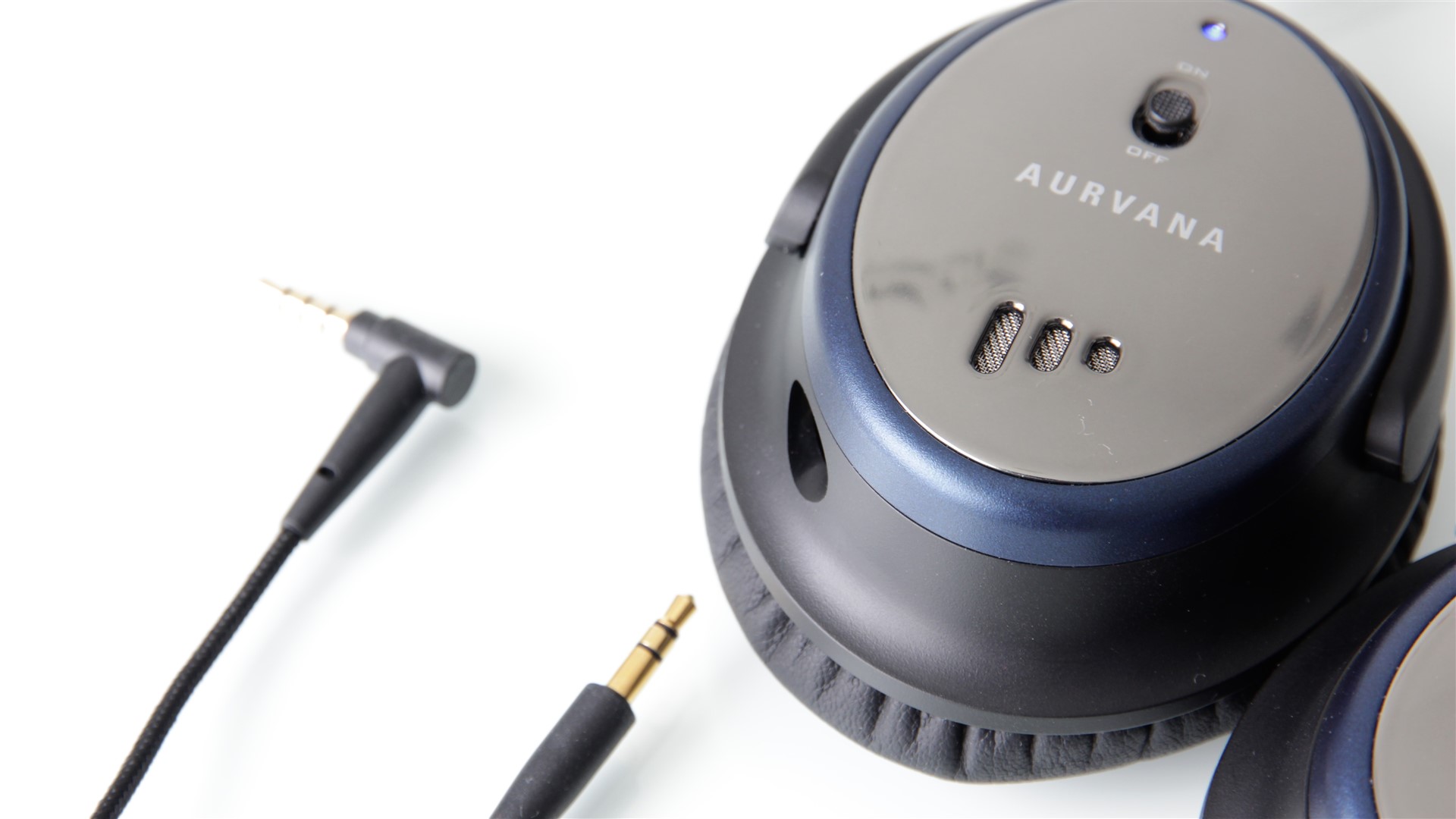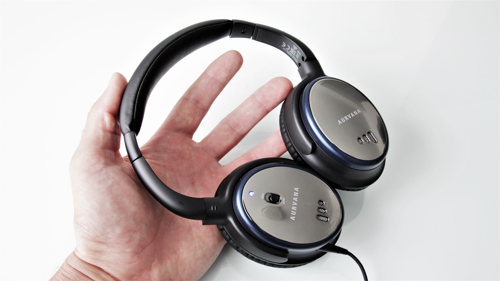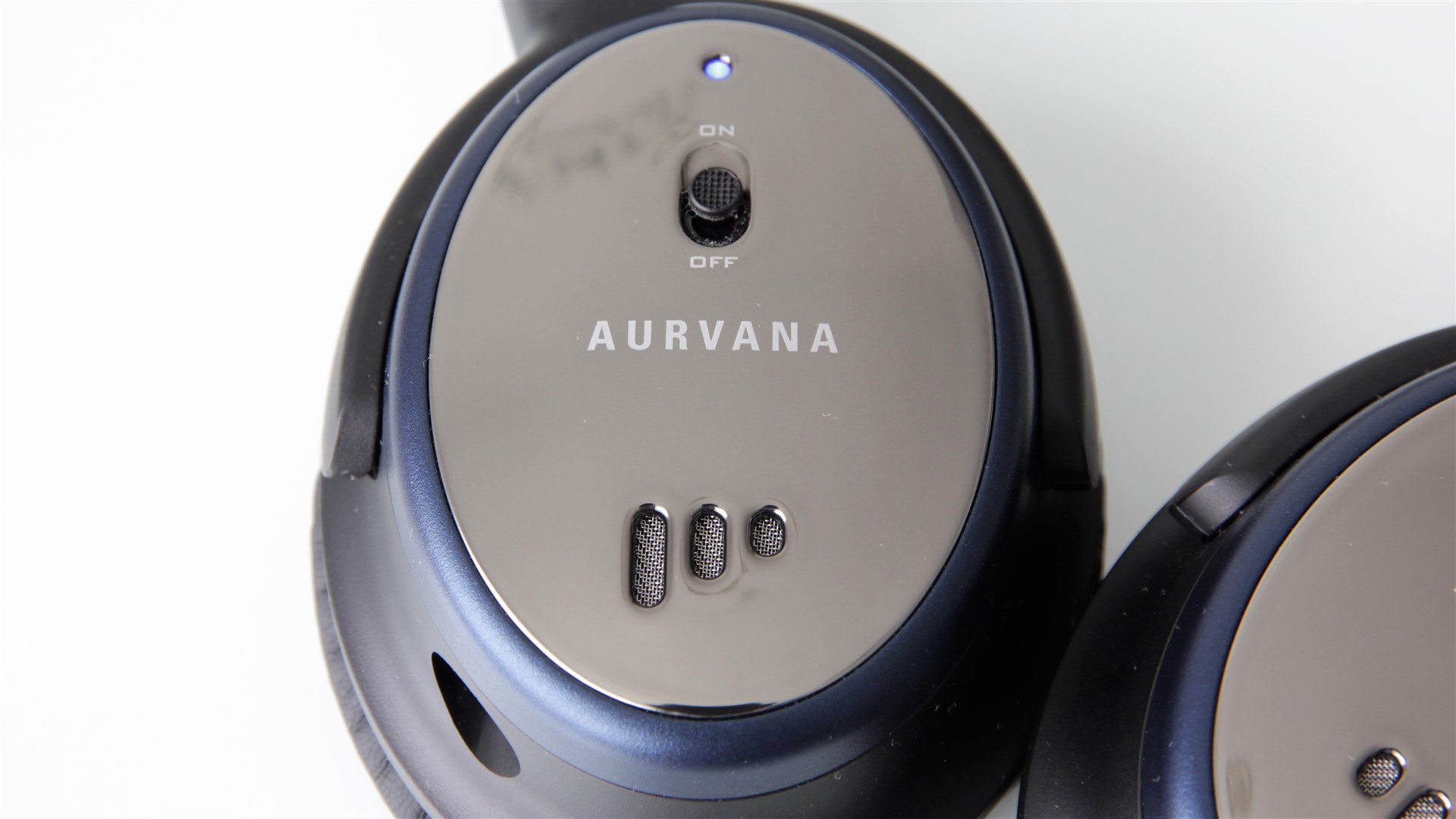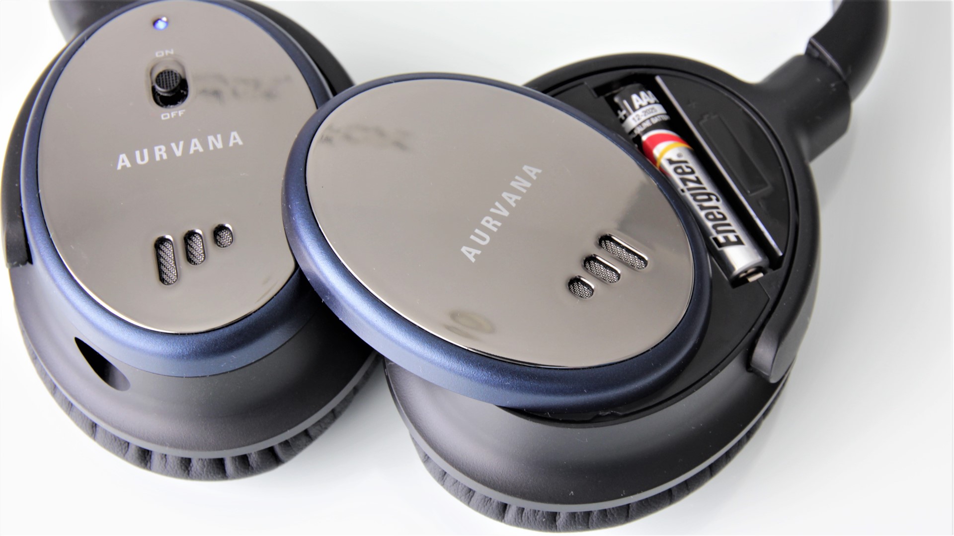Pe ambele cupe avem câte trei mici grile în spatele cărora sunt microfoanele necesare preluării zgomotelor de fond. Pe cupa stângă vedem un buton On/Off pentru ANC și un LED ce se aprinde în albastru când funcția de anulare a zgomotelor de fond este activată. Cupa dreaptă adăpostește bateria AAA necesară alimentării sistemului ANC. Pentru a avea acces la aceasta este nevoie doar să rotim ușor capacul cupei în sens contrar acelor de ceasornic.