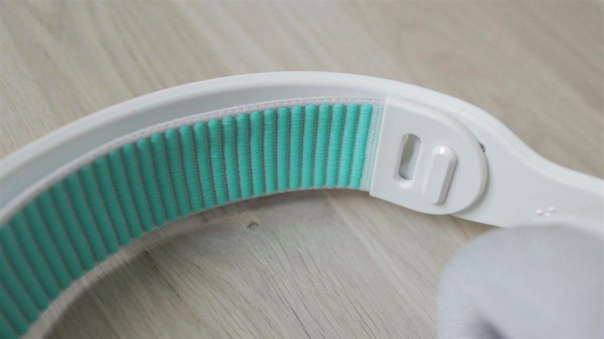 Noua abordare în ceea ce privește banda de pe cap, și nu mă refer aici la culoarea ei, ci la faptul că aceasta este solidară de elementul ce face legătura dintre cele două cupe, respectiv elementul din plastic. Banda textilă poate fi mutată cu o poziție pentru a se potrivi mai bine anumitor utilizatori și mai există un mic reglaj pentru lungimea totală a elementului din plastic din prinderea de pe fiecare cupă, care culisează, însă doar pe circa 2 cm. Aceste prinderi permit și o mișcare la 360 de grade, însă foarte limitată. Nu este problemă cu găsirea poziției corecte pe cap, chiar dacă toate reglajele sunt limitate.