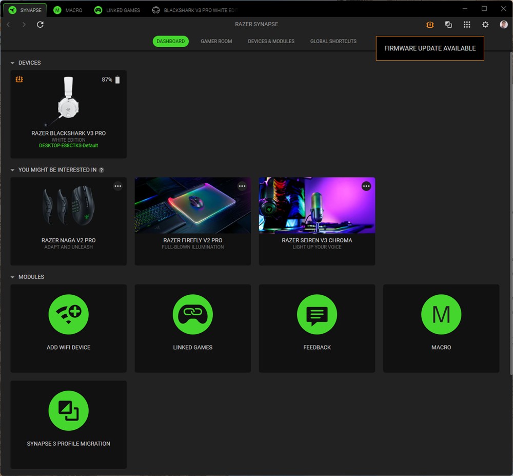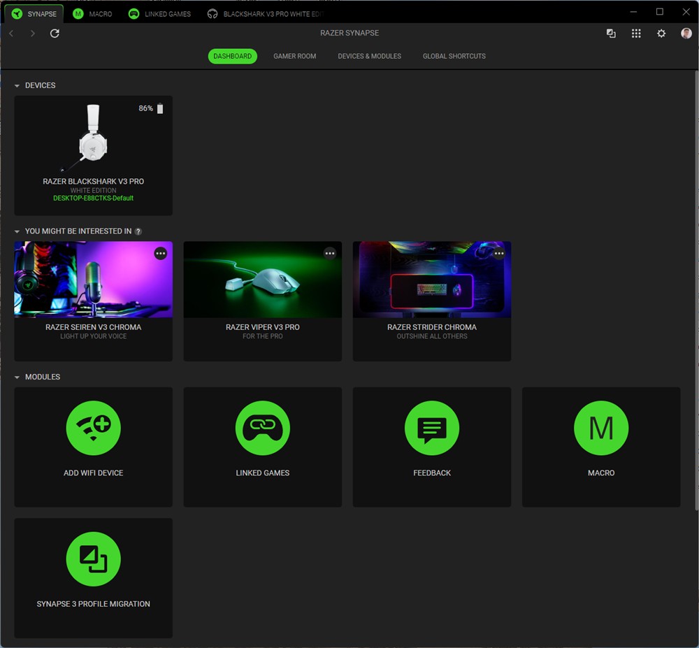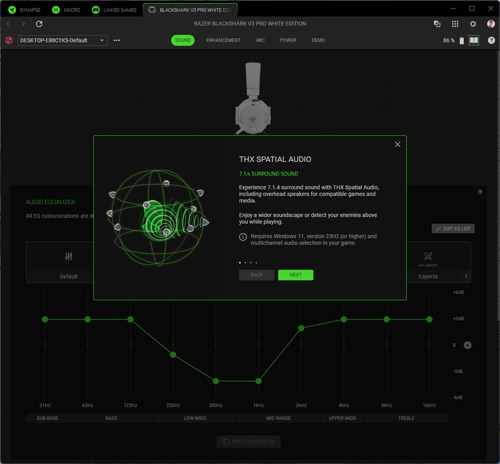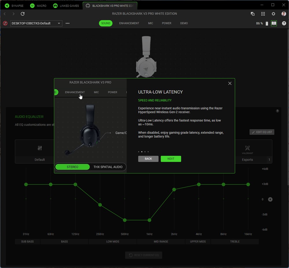 Capturi de ecran din Synapse 4 cu căștile Razer BlackShark V3 Pro: