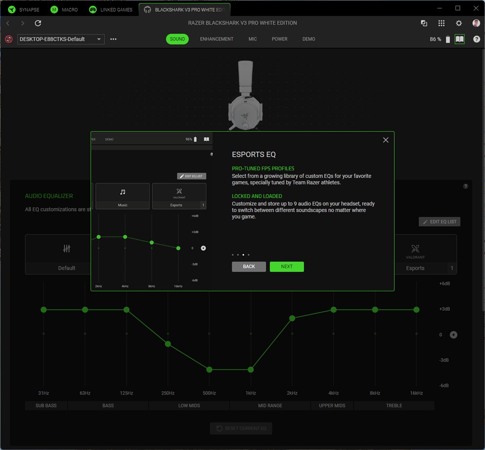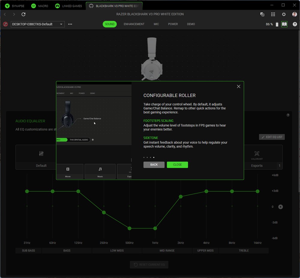 Asta contează cel mai tare în gaming, așa că Razer BlackShark V3 Pro conving fix acolo unde era nevoie să o facă. Doar că asta nu este totul. Sunt mai multe preseturi gata realizate și memorate direct în căști, iar diferența dintre ele este uriașă. De la o abordare plată, naturală pe Default, la o extindere a dimensiunilor pe Game, la un sunet mai cald pe Movie și până la o dinamică mai largă pe Music și o scoatere clară în evidență a vocilor pe E-Sports, diferențele sunt sesizabile. Nu cred că am mai întâlnit așa o deosebire între aceste preseturi gata prezente pe căști încă din fabrică. Mai sunt câteva în aplicație Synapse de PC, dar ai și egalizator cu 10 benzi din care poți face toate ajustările preferate. Cert este că Razer BlackShark V3 Pro permit o exprimare largă a preferințelor tale, au de unde să le acopere pe toate.
