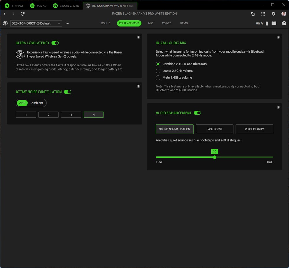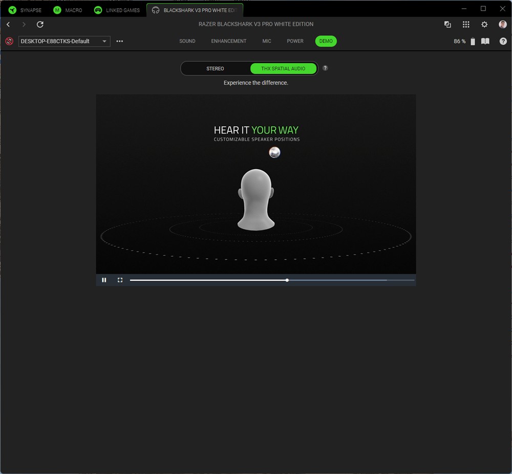 Acum, să vorbim puțin și despre controlul prin software. Eu am încercat doar aplicația Synapse 4 pentru Windows, dar Razer BlackShark V3 Pro permit control și prin aplicație de smartphone, Razer Audio disponibilă atât pe Android, cât și pe iOS.