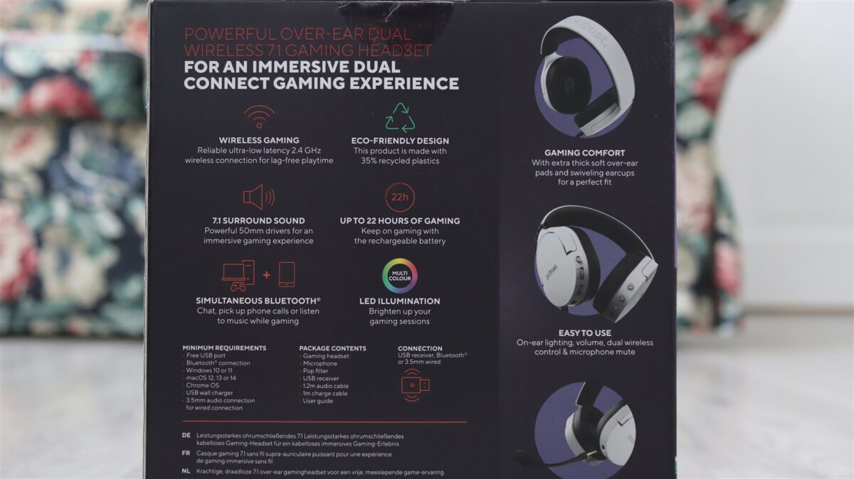 Trust GXT491 FAYZO sunt căști ce pot fi conectate la sursă în trei moduri. Două dintre ele sunt wireless, adică fie prin Bluetooth, fie prin adaptorul RF 2.4GHz din pachet, în timp ce ultimul presupune să legi căștile prin cablu la dispozitive compatibile.