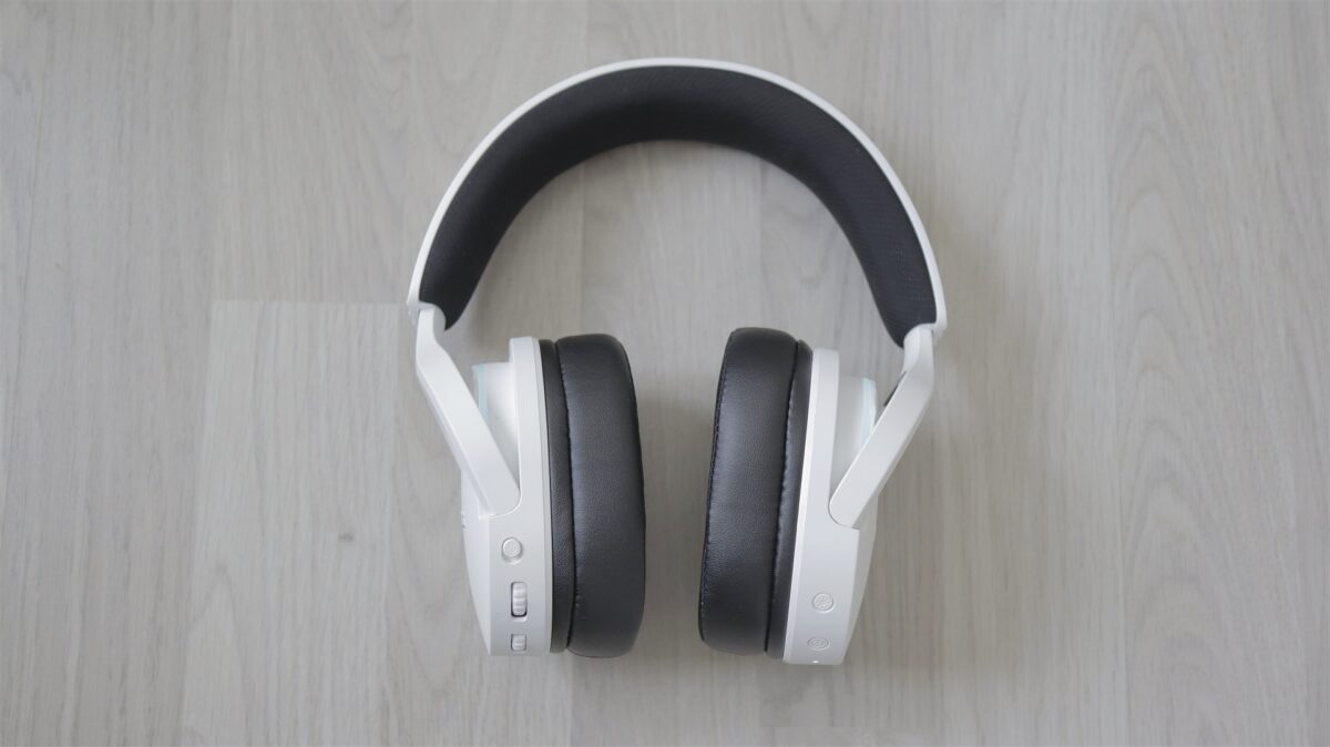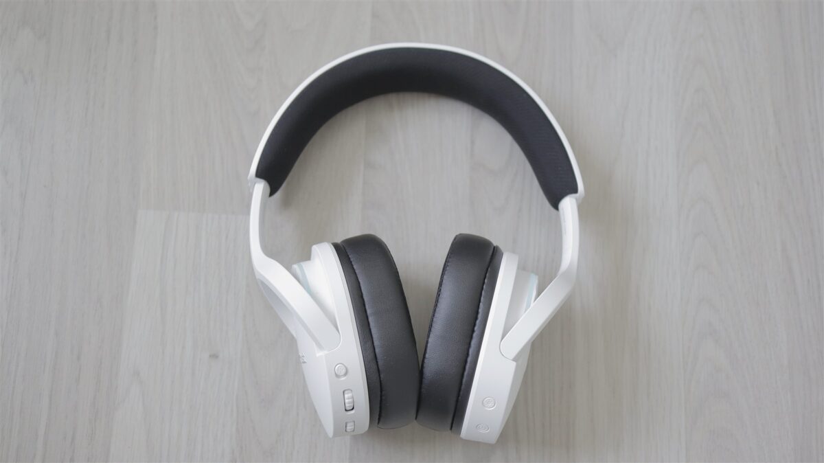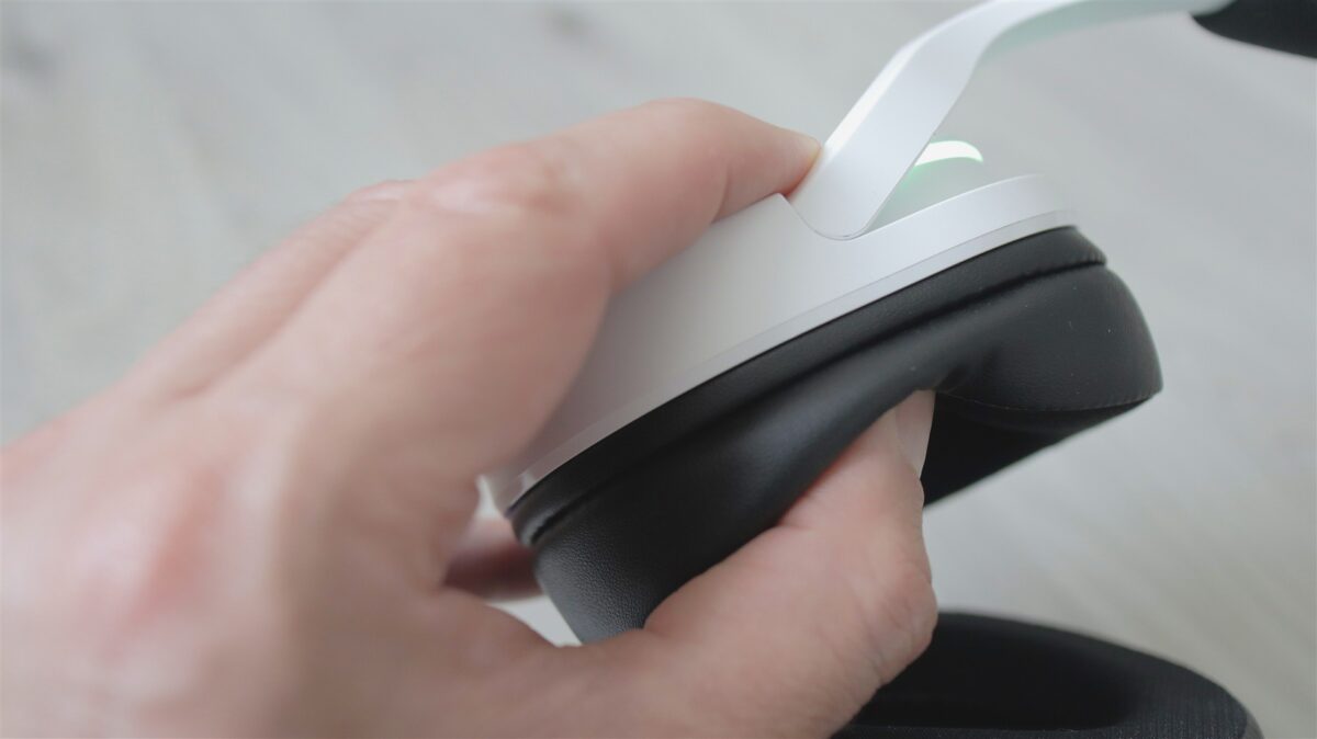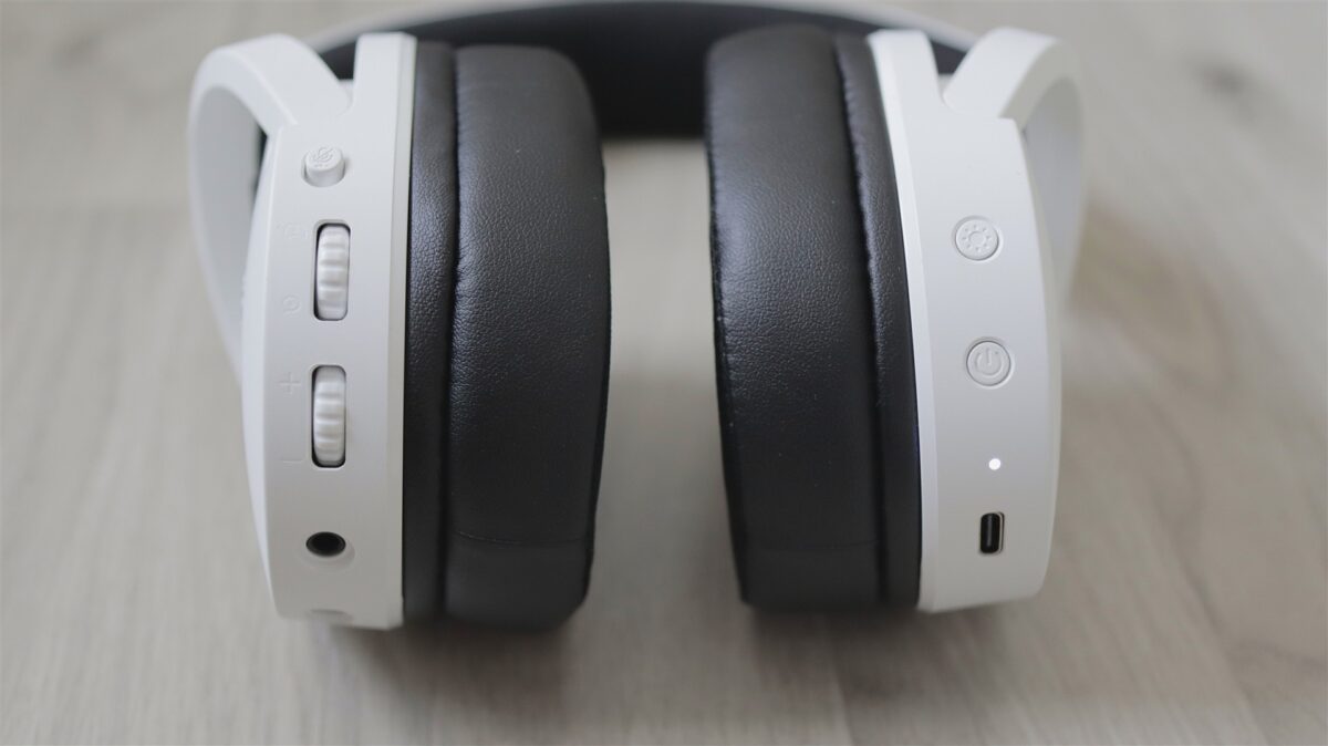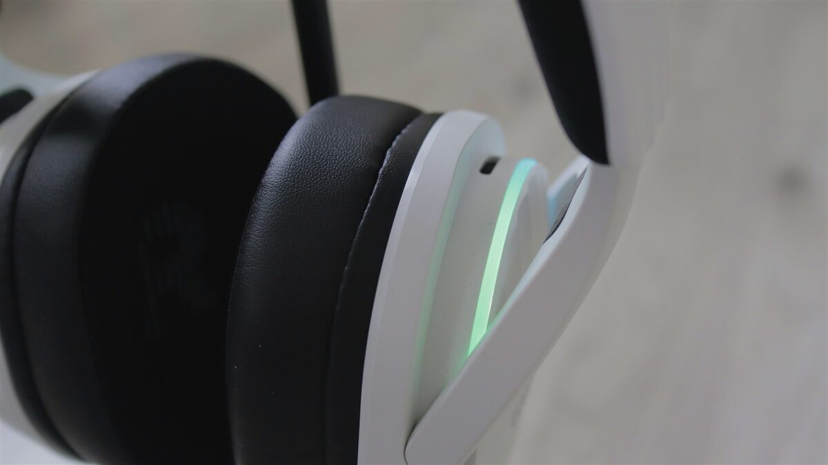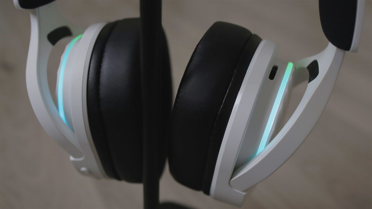 Singurele elemente care te duc cu gândul la categoria de gaming sunt cele două benzi cu iluminare color (nu RGB), câte una pe partea superioară a fiecărei cupe. Dar nici acestea nu ies neapărat în evidență, iar dacă vrei să treci mai neobservat cu aceste căști pe cap, atunci poți opri foarte simplu iluminarea din butonul dedicat, cel de pe cupa dreaptă, în imediata apropiere a butonului Power. Tot în aceeași zonă este și un LED de status, iar mai jos portul USB-C.