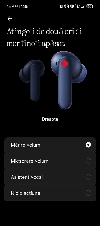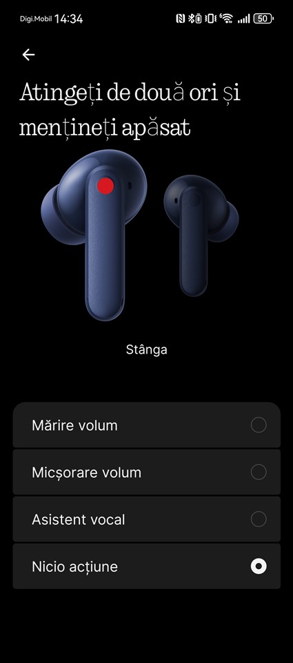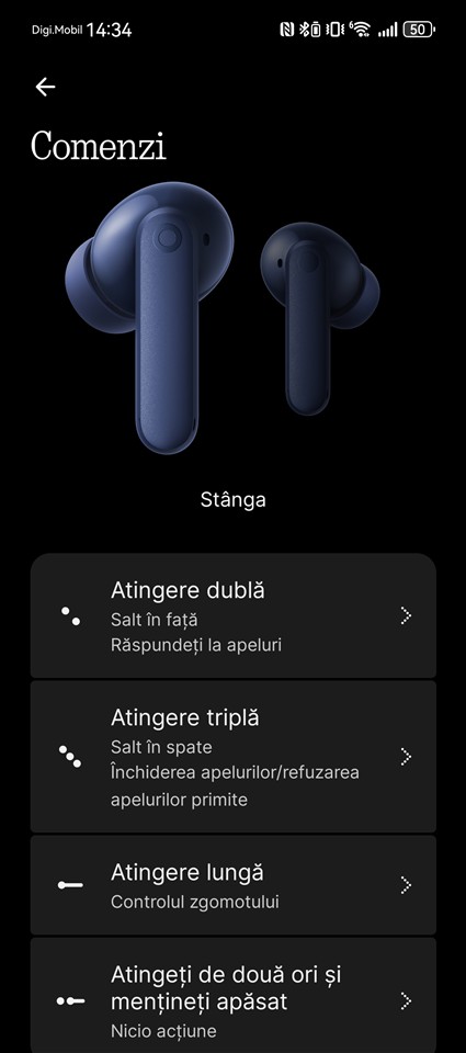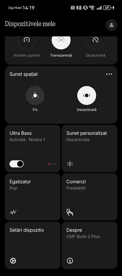 Amintesc aici și de suportul pentru gesturi, încă o funcție pe care, sincer, nu mă așteptam să o găsesc la o asemenea pereche de căști, și mă refer aici la prețul la care sunt propuse CMF Buds 2 Plus (by Nothing). Sunt mai multe tipuri de gesturi pe care căștile le pot recunoaște, poți modifica din aplicație ce și cum îți dorești (în anumite limite, desigur). Ce trebuie reținut este că, odată ce înveți puțin unde și cum trebuie să acționezi, totul decurge apoi ca la carte, ca să mă exprim astfel.