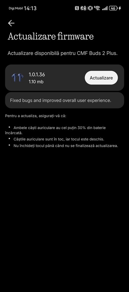 Aș vrea să vorbesc aici și despre cum stau, cum se așează aceste căști în urechi. Din partea mea, pentru urechile mele, foarte bine. Nu am simțit că pot cădea involuntar, deși nici nu sunt cele mai fixe, la mișcări mai bruște ale capului aș spune că se pot mișca puțin, fără însă a apărea neapărat riscul să iasă cu totul din urechi și să cadă. Confortul la purtare este foarte bun, CMF Buds 2 Plus (by Nothing) nu m-au deranjat nici când le-am folosit mai mult de 2 ore continuu.