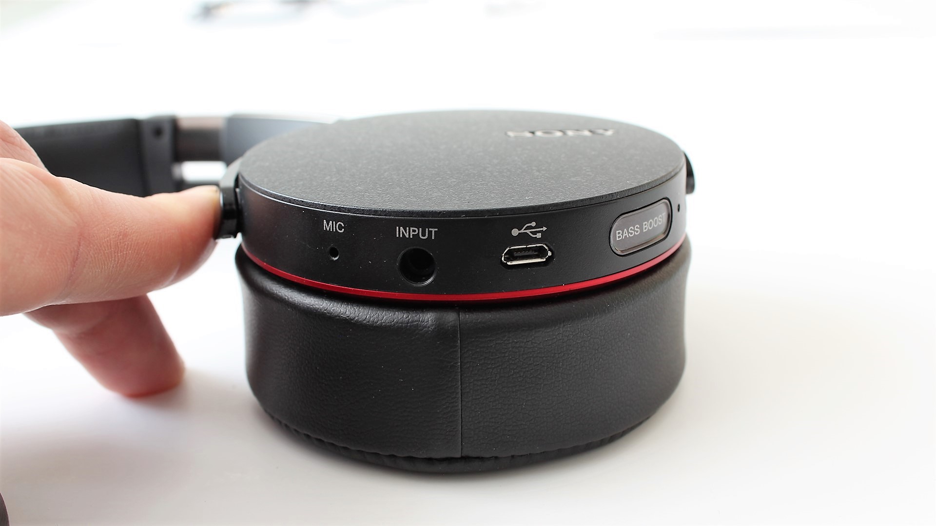 Să vedem cum sunt dispuse elementele de conectivitate. Pe cupa stângă avem butonul power, care activează automat și bluetooth-ul, butonul Bass Boost, portul microUSB, ce permite încărcarea bateriei, jack-ul de 3.5 mm și microfonul. Prin conectivitate bluetooth cu telefonul, căștile Sony MDR-XB950BT se transformă în kit hands free grație microfonului.