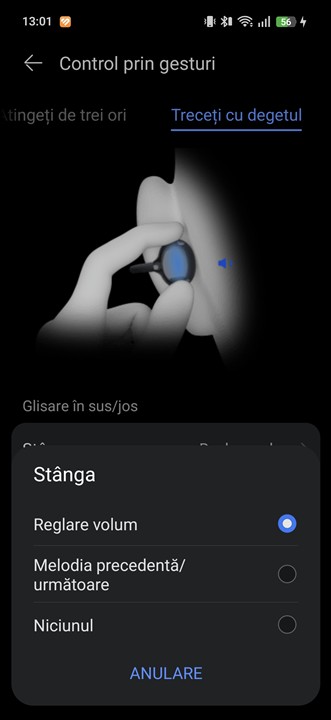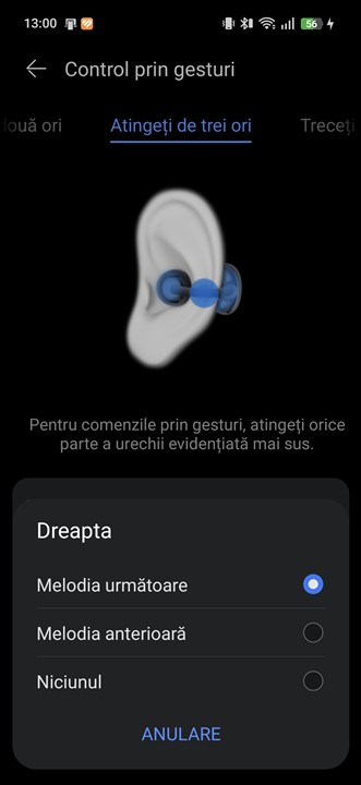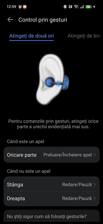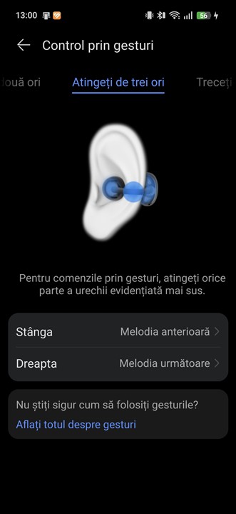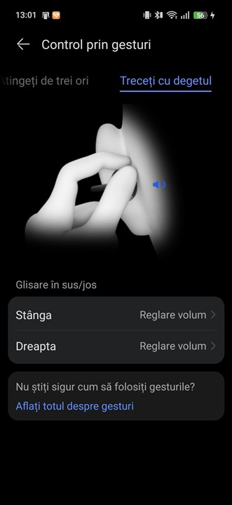 Pe lângă recunoașterea gesturilor tactile de atingere (dublă sau triplă atingere) și a mișcărilor capului, așa cum aveau și generația anterioară, HUAWEI FreeClip 2 introduc și recunoașterea gesturilor de swipe. Acestea pot fi setate pentru reglarea volumului sau pentru a schimba melodiile, însă gestul în sine nu este cel mai simplu de executat. Asta fiindcă mișcarea trebuie făcută pe exteriorul elementului Comfort Beam, care este compact și cam greu de atins, fiind în spatele urechii. Dar, până la urmă, este bine că avem și această posibilitate, deci poți regla volumul din căști acum și fără a avea telefonul sau dispozitivul sursă aproape.