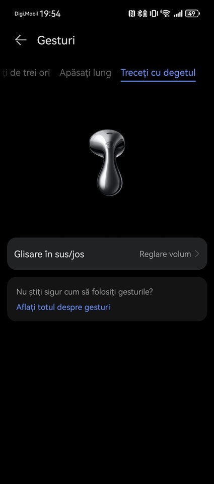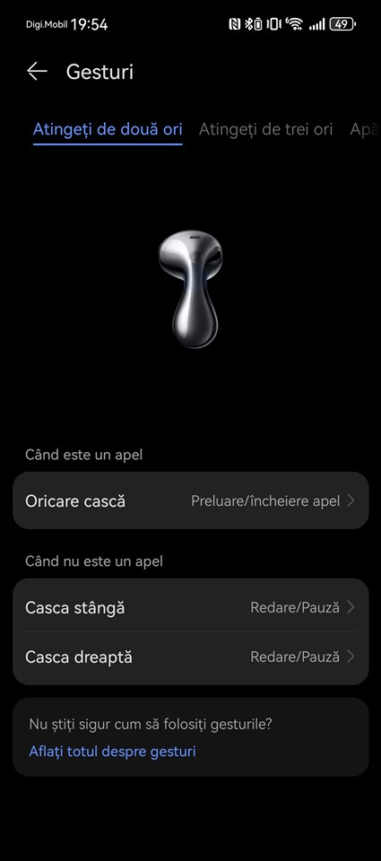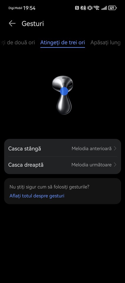 Aș mai vrea să amintesc aici de gesturile tactile pe care le poate recunoaște această pereche de căști. Sunt deja clasicele atingere dublă ori triplă, atingere prelungită și swipe de jos în sus sau invers. În funcție de preferințe, poți atribui, în anumite cazuri, diferite acțiuni, dar sunt cele clasice, fără ceva ieșit din comun (Play / Pause, trecere la următoarea melodie, respectiv revenire la anterioara, activare asistent vocal de pe smartphone, reglare volum etc).