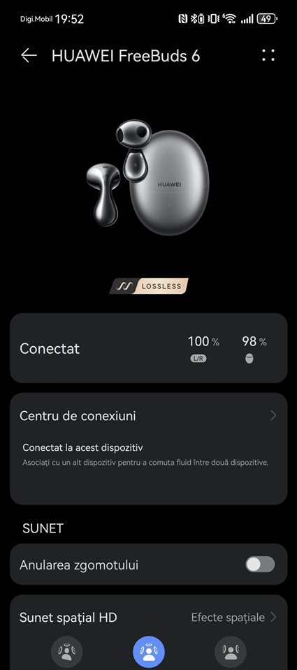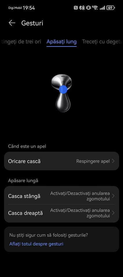 Ce aduce în plus Huawei FreeBuds 6 este recunoașterea unor gesturi, unor mișcări ale capului. Așadar, doar prin mișcarea capului precum ai transmite „Da” ori ”Nu” poți prelua sau încheia un apel, Am testat și totul funcționează conform cu așteptările, atât pentru gesturile tactile, cât și pentru acestea de mișcare naturală a capului. Sigur că și tu, ca utilizator, trebuie să realizezi aceste gesturi și atingeri conform, dar nimic complicat, ci mai degrabă totul perfect natural.