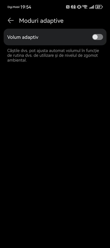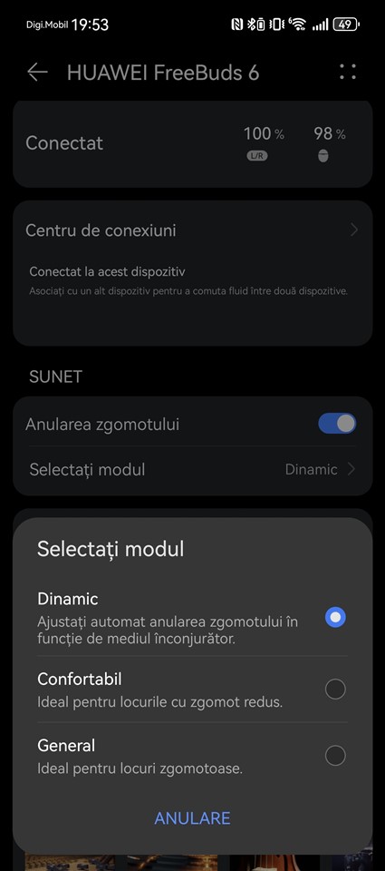 Despre sistemul de anulare activă a zgomotului de fond (ANC), din nou foarte bine, dar cu aceeași mențiune că trebuie să înțelegi ce fel de potrivire în ureche oferă Huawei FreeBuds 6. Atât timp cât canalul auditiv nu este „blocat” complet de către căști, sunt evident mai multe sunete din afara căștilor ce ajung în ureche. Așadar, izolarea pasivă nu este la același nivel cu al unor căști in-ear, deci ANC-ul are mult mai mult de lucru și, în plus, nu poate elimina complet zgomotul ambiental. Numai că sistemul activ își face totuși extrem de eficient treaba, unele frecvențe, cele mai joase și mai constante, fiind anulate aproape în totalitate, ceea ce mi s-a părut impresionant. Sigur că alte tipuri de sunete nu sunt la fel de bine atenuate ca în cazul căștilor in-ear precum Huawei FreeBuds Pro 4, de exemplu, dar pentru căști open-fit ANC-ul este extrem de eficient.