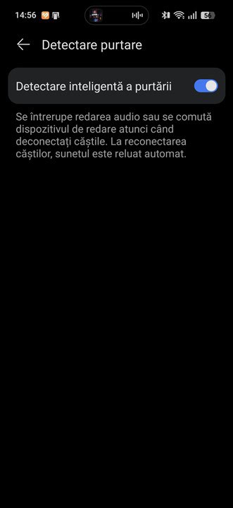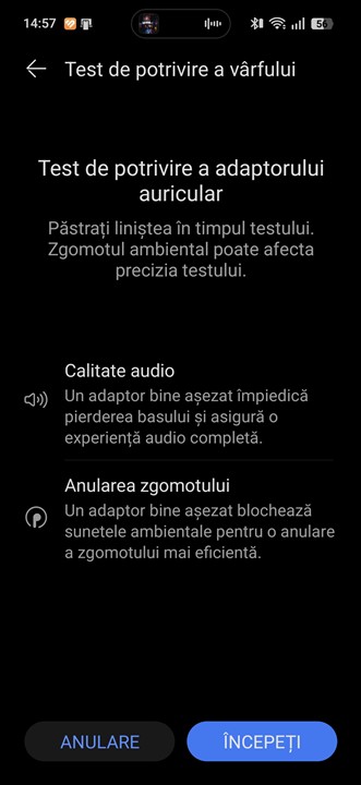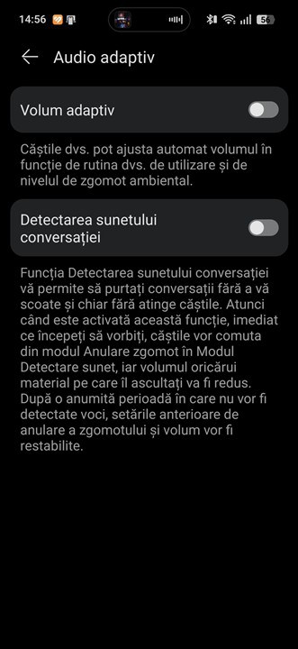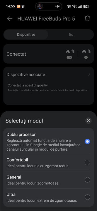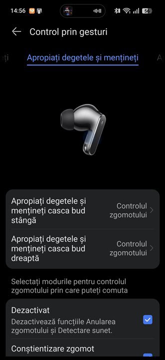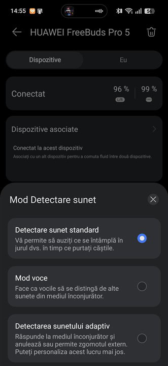 Aparte de ANC cu setări Dublu procesor, Confortabil, General și Ultra, există și modul Conștientizare zgomot, care practic este cumva opus ANC-ului, adică chiar sunt preluate sunetele din jurul tău și aduse în căști. Pe Conștientizare zgomot, poți alege dintre Standard, Voce (distingi mai bine vocile din jurul tău, separate mai bine de celelalte sunete) și Detectare sunet adaptiv. Există și posibilitatea ca modul Conștientizare zgomot să se activeze automat atunci când tu începi să vorbești. Nu este ceva noutate absolută, am mai văzut asta și la alți producători, dar nu și la HUAWEI până acum. Cert este că poți folosi acest mod în anumite situații și chiar ajută, deși nu funcționează mereu așa cum ar trebui.