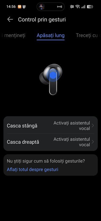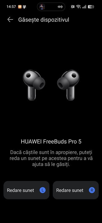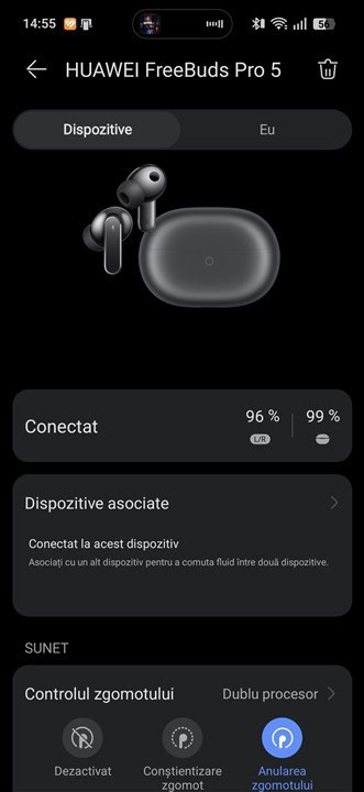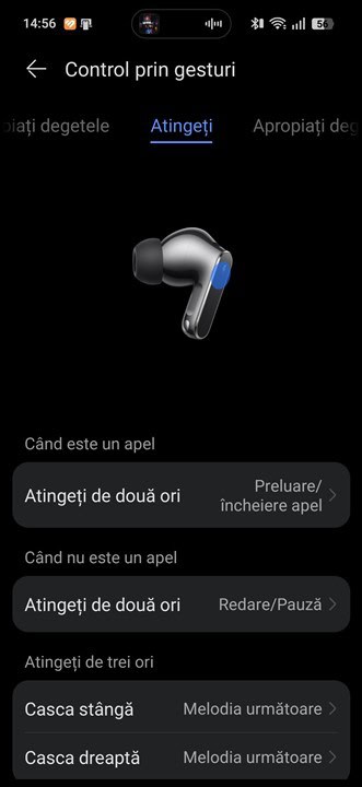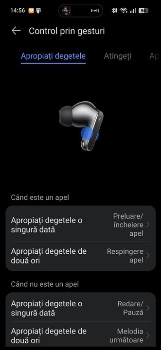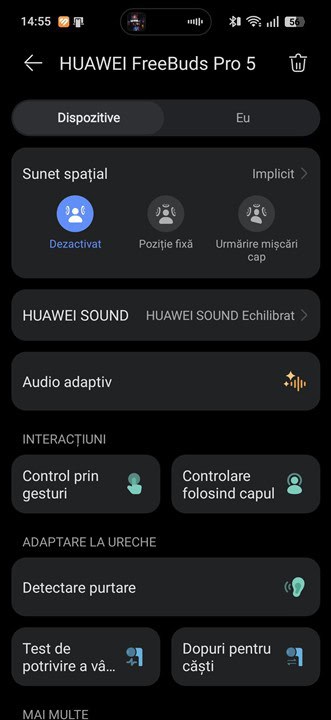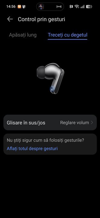 Ce aș vrea să mai precizez aici ține de gesturile de control recunoscute de HUAWEI FreeBuds Pro 5. Vorbim despre atingeri (loviri ușoare, să le numim), de strângeri ale barei (ciupituri, cum apar în aplicație), dar și de glisare / swipe. Dacă primele două „seturi” de gesturi (atingere și ciupitură) sunt recunoscute rapid și precis, fiind și simplu de executat, la swipe este ceva mai greu. Practic trebuie să glisezi în sus sau în jos pe brațul căștilor, pe zona dinspre față. Este ceva cam greu, cel puțin pentru mine, fiindcă de aproape fiecare dată aproape că scot căștile din urechi la această mișcare. Trebuie să glisezi fin ca să nu miști căștile, dar dacă ești prea fin nu poți regla volumul sau o faci din prea multe încercări.