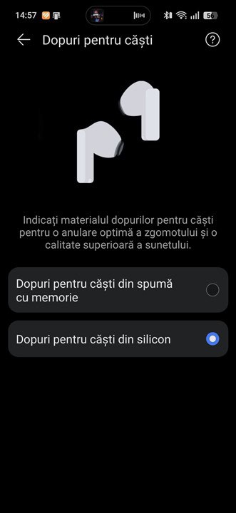 În cutia compactă în care căștile vin puse în carcasa lor, mai sunt trei perechi de dopuri de urechi din silicon, ghid de pornire rapidă și certificat de garanție. Așa cum am spus și când am adus primele impresii, mi se pare destul de ciudat că nu mai sunt oferite dopuri / manșoane de urechi din spumă cu memorie, așa cum am găsit în cutia FreeBuds Pro 4, dar nici măcar un cablu de încărcare. Sincer, eu am preferat mereu dopurile din spumă alături de FreeBuds Pro 4 și mi-ar fi plăcut să le pot încerca și pe noua generație.