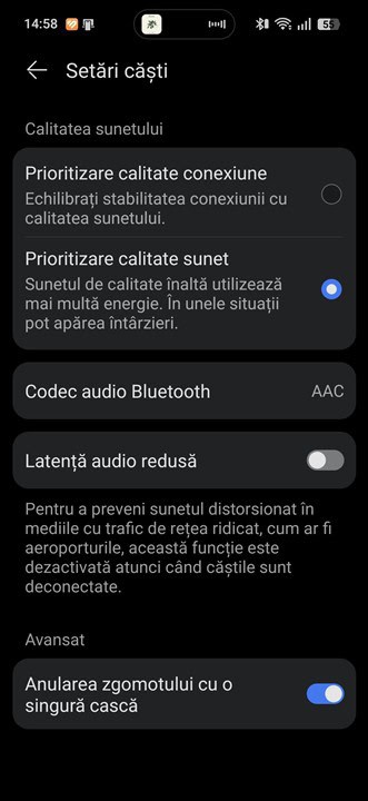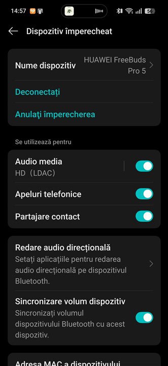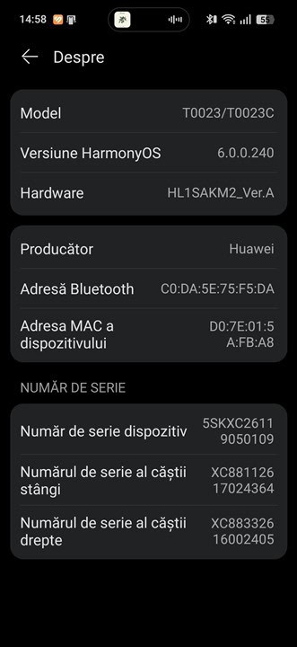 Aici, încă un pas în față, în sensul că se trece la Bluetooth 6.0, o versiune cu mult mai capabilă decât tot ce înseamnă edițiile 5.x. Este păstrată conexiunea dublă, cu trecere rapidă și chiar automată între două dispozitive, iar cu anumite telefoane și tablete HUAWEI, căștile FreeBuds Pro 5 pot comunica la o rată de nu mai puțin de 2.3 Mbps, cu adevărat Hi-Res Audio Wireless. Din păcate, nu doar că așa ceva este posibil strict cu dispozitive HUAWEI, dar și lista acestora, care suportă rate de 2.3 Mbps, este foarte restrânsă. Atât de limitată încât o pot trece aici: Mate X7 și X6, seria Pura 80, Nova 14 Pro, MatePad 12 X, MatePad 12.2 și MatePad Pro 12.2.