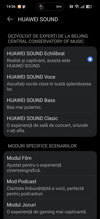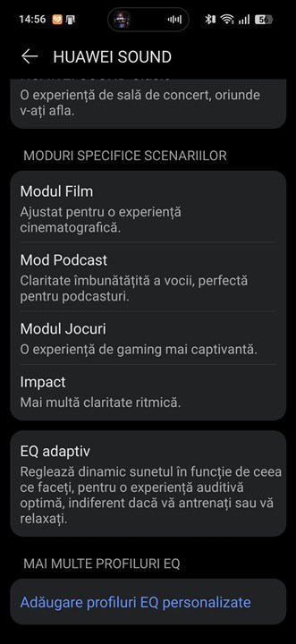 Aparte de cele patru preseturi pregătite de HUAWEI Sound, mai sunt Modul Film, Podcast, Jocuri și Impact, dar avem și un EQ Adaptiv, care încearcă să regleze dinamic sunetul în funcție de ceea ce asculți, dar mai ales de ceea ce faci (dacă te miști sau stai pe loc, dacă în jurul tău este zgomot sau nu etc).