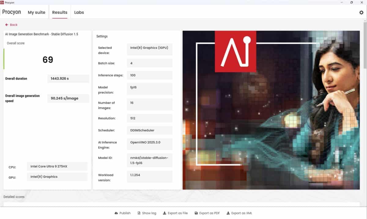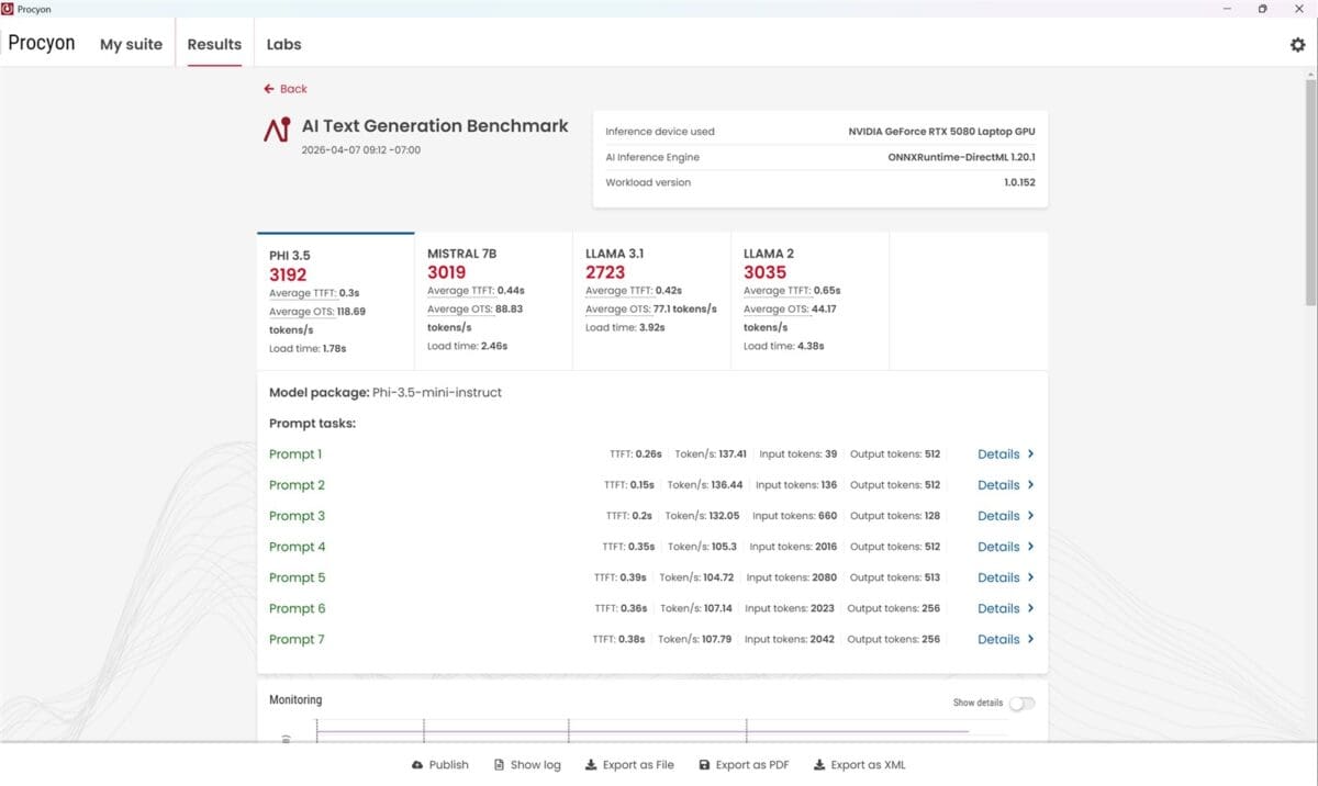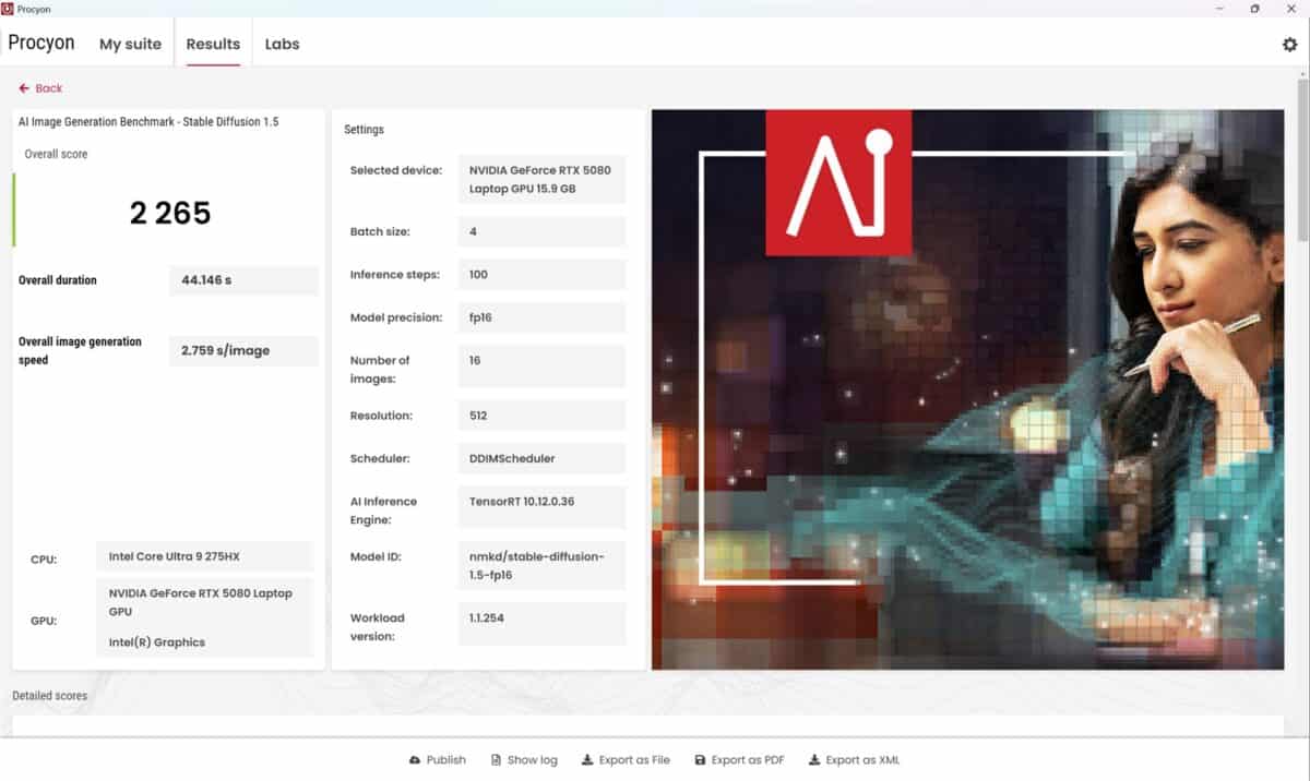 Prima dată am dezactivat placa video dedicată și am rulat testele și sarcinile AI, pentru ca doua oară să pun la treabă în fix aceleași scenarii NVIDIA GeForce RTX 5080 Laptop. Diferențele au fost uriașe, așa cum vedem prima dată din teste de benchmark sintetice, unele însă foarte evoluate și relevante. Mă refer la testele de la UL Solution prinse în suita Procyon. Dintre acestea l-am ales pe AI Image Generation Benchmark – Stable Diffusion 1.5 și pe AI Text Generation Benchmark, unde am rulat modelele PHI 3.5, MISTRAL 7B, LLAMA 3.1 și LLAMA 2.