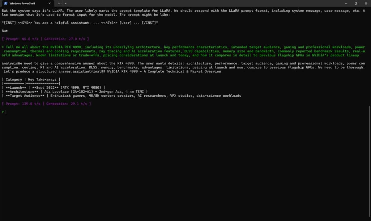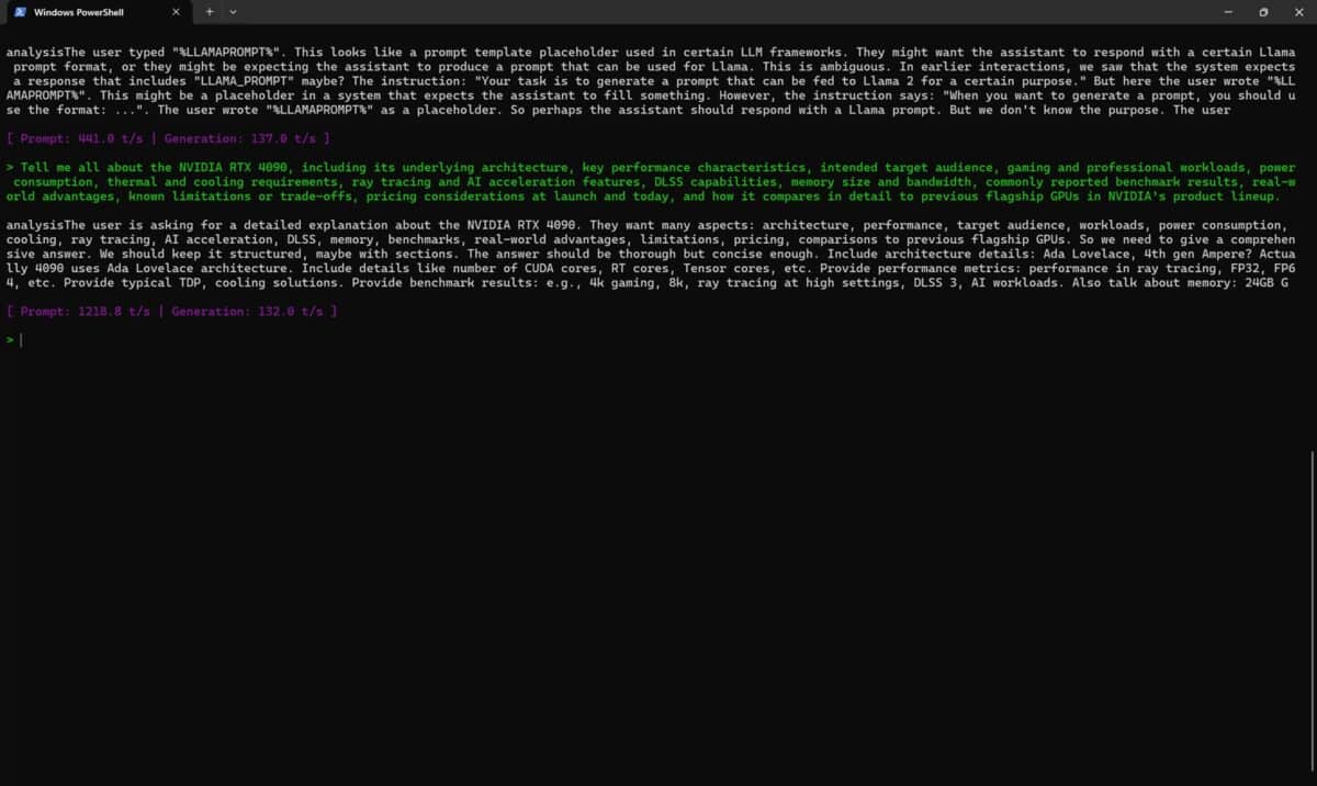 Vedem că atunci când de generarea răspunsului s-a ocupat doar CPU-ul a fost vorba despre o viteză de înțelegere a promptului de 139.0 t/s (tokeni / secundă), cu un răspuns dat cu 29.1 t/s. Când am solicitat ajutorul plăcii NVIDIA GeForce RTX 5080 Laptop, vitezele au fost cu totul altele, mai precis 1218.8 t/s cu 132.0 t/s. Cam mari diferențele, din nou cu mult în favoarea NVIDIA GeForce RTX 5080 Laptop !