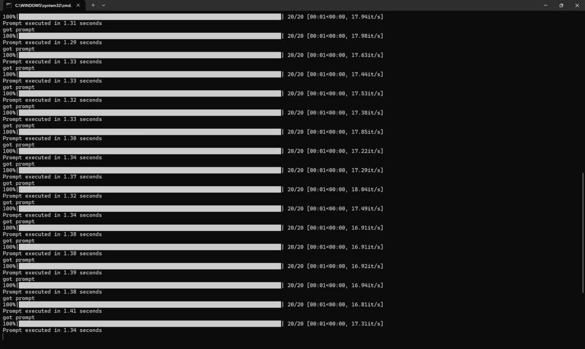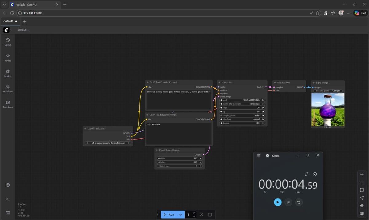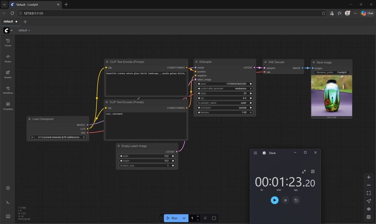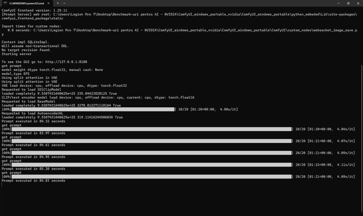 În ComfyUI 0.8.25 nu am mai avut parte de detalii, de log-uri cu duratele, așa că am fost nevoit să folosesc cronometrul din Windows. Doar că nu puteam fi suficient de rapid spre a opri la timp cronometrul când NVIDIA GeForce RTX 5080 Laptop randa rezultatul, așa că în captura de mai sus apar undeva la 4 secunde, fiind în fapt vorba tot despre circa 1.5 secunde. Când a randat doar procesorul Intel, durata a fost de peste 1 minut și 20 de secunde, deci undeva tot la mai mult de 80 de secunde.
