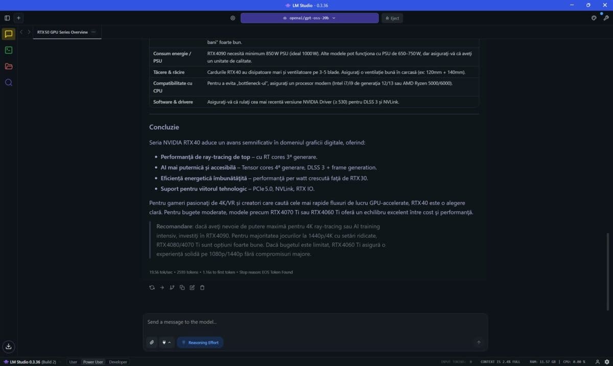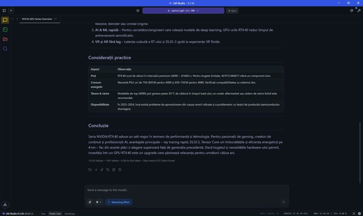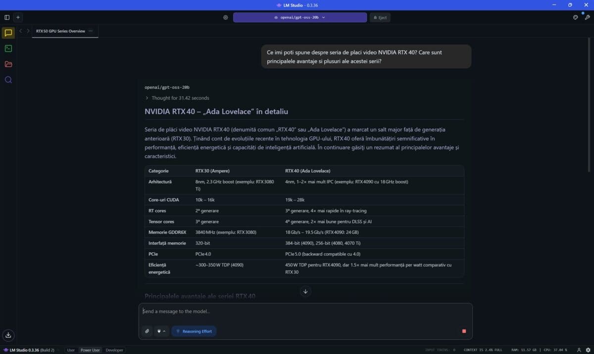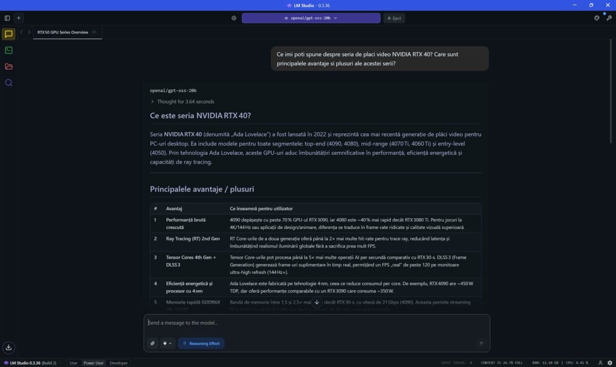 Prima dată am folosit programul LM Studio, în care am încărcat și pus la treabă modelul openai/gpt-oss-20b. Am pus aceeași întrebare, aceeași solicitare de două ori, prima dată cu placa video NVIDIA GeForce RTX 5080 Laptop dezactivată, a doua oară cu aceasta pusă la treabă de LM Studio.