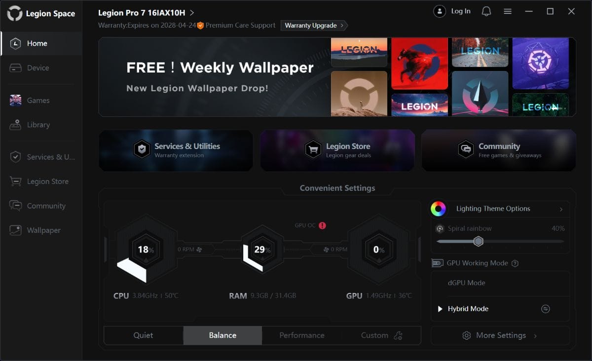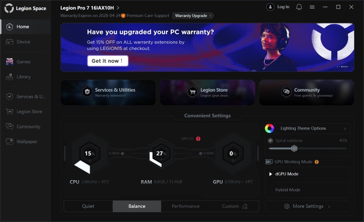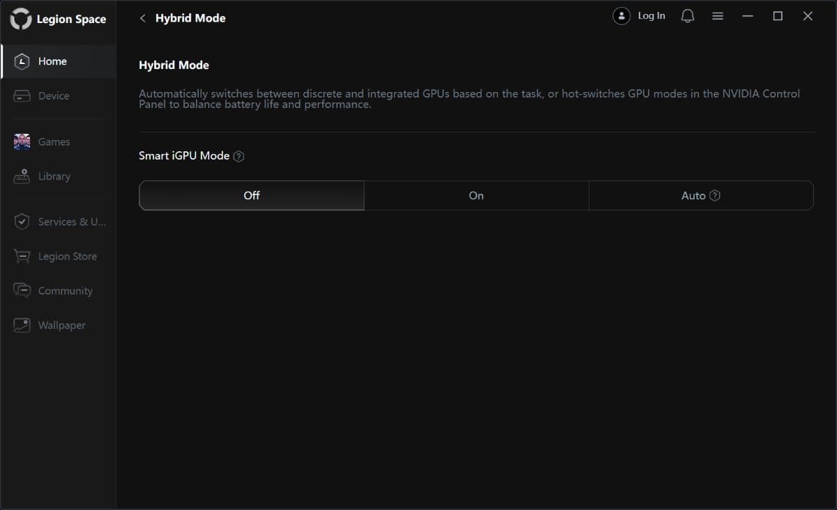 Lenovo Legion Pro 7 (16IAX10H) îți dă posibilitatea de a folosi strict placa video dedicată (dGPU) în sarcinile care o solicită sau de a o dezactiva complet și a te baza doar pe CPU cu al său accelerator grafic integrat și cu ale sale nuclee NPU.