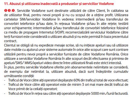 Totuși, NELIMITAT nu trebuie luat ca atare. Există o mică limitare, pentru cei care ar folosi rețeaua Vodafone în mod abuziv. Mai jos aveți o captură de ecran din documentul Vodafone intitulat Termenii și Condițiile Generale pentru Persoane Fizice – Consumatori. Îl găsiți aici. La pagina 16, punctul 11 cu denumirea Abuzul și utilizarea inadecvată a produselor și serviciilor Vodafone se precizează: