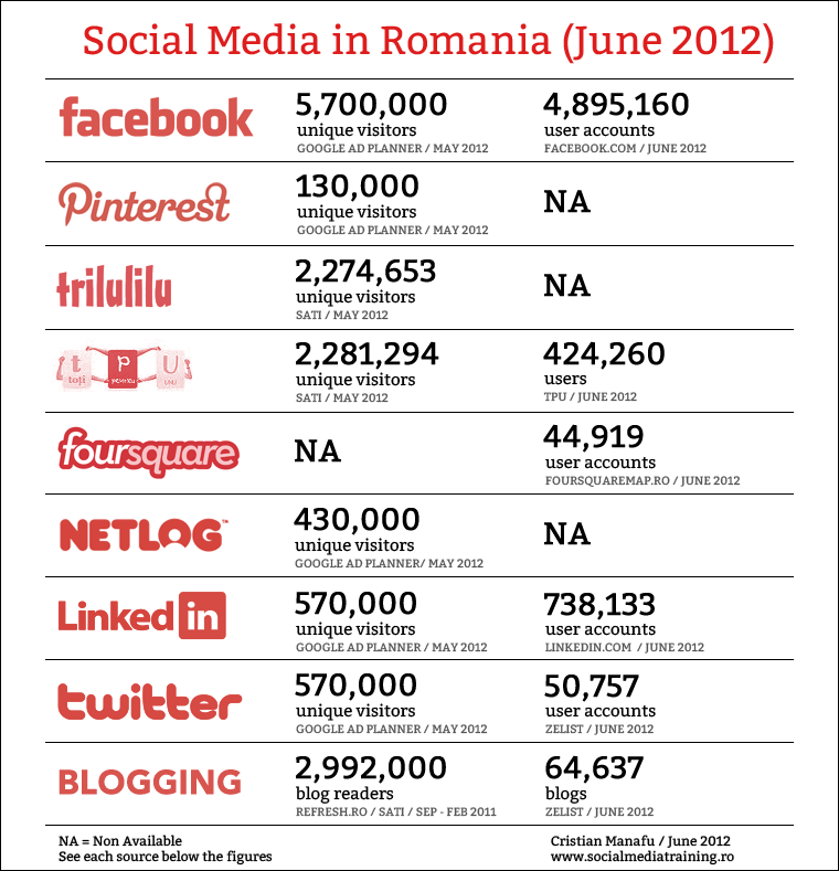 Pe 11 iulie 2012 are loc Social Networks Conference în ediția pe 2012 sub organizarea Evensys. Înainte de a trece în subiectele zile vă invit să vedeți o statistică referitoare la rețelele sociale din România. Observați că Facebook se apropie vertiginos de 5 milioane de conturi în țara noastră. Este o forță de care trebuie să se țină cont pentru cei care vor să-și dezvolte afacerile prin intermediul online-ului. Graficul este luat de pe socialmediatraining.ro.