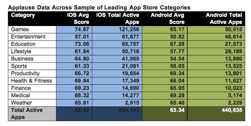 Aparent, iTunes Store este mai mare şi mai relevant decât Google Play – acest lucru reiese dintr-un algoritm numit Applause. Practic, acest algoritm măsoară satisfacţia utilizatorilor şi performanţele aplicaţiilor, combinând ulterior toate datele într-un indice numit „Applause Score„. Mai jos avem un tabel ce conţine scorul total obţinut de o platformă în funcţie de categorie, scorul total şi numărul de aplicaţii active pe categorie/total.
