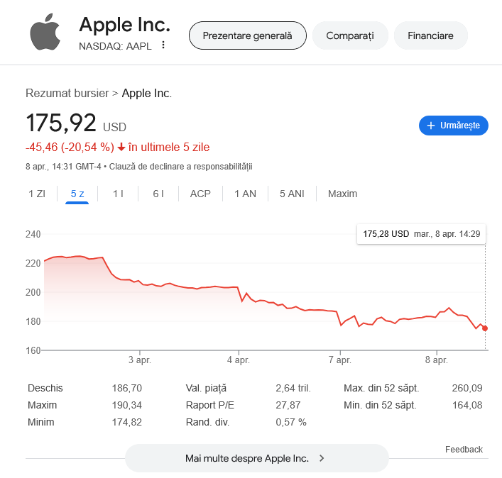 Soluţia ideală nu cred că există pentru Apple, însă sunt sigur că au oameni suficient de bine pregătiţi pentru a găsi variante optime. Până atunci însă, acţiunile Apple au luat-o la vale în ultimele zile (în 2 aprilie erau undeva la 224 dolari, iar azi, 8 aprilie, au ajuns pe la 175 dolari).