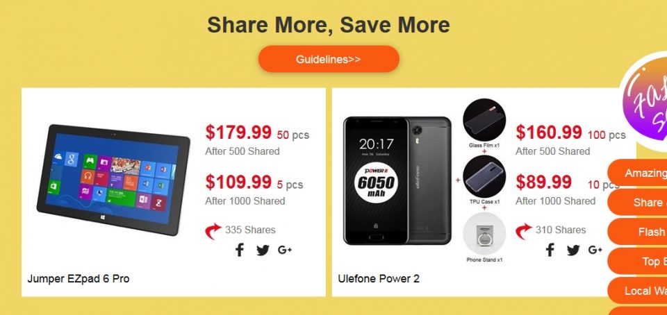 Aici avem două produse a căror preţuri pot fi reduse în funcţie de numărul de share-uri. Pe 28 august la ora 12:00 (ora României) vor putea fi achiziţionate la preţul minim dacă ating minim 1000 de share-uri: