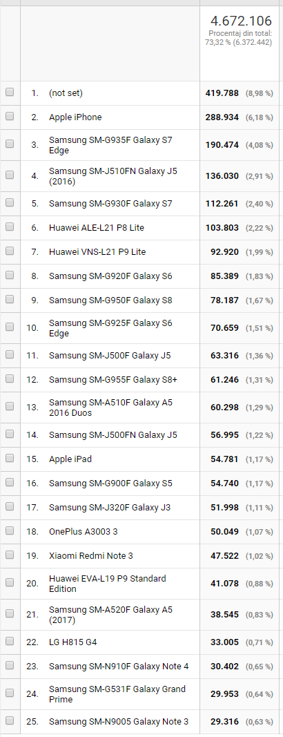Observați că în frunte se află Samsung GALAXY S7 Edge, Samsung GALAXY J5 2016, GALAXY S7, dar și Huawei P8 Lite și P9 Lite.