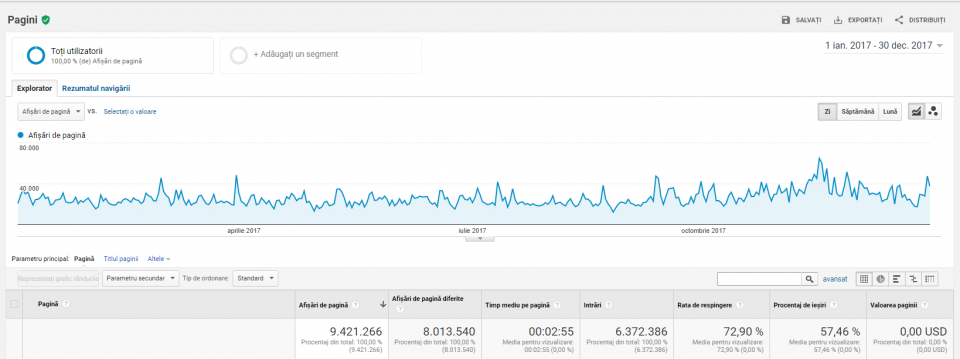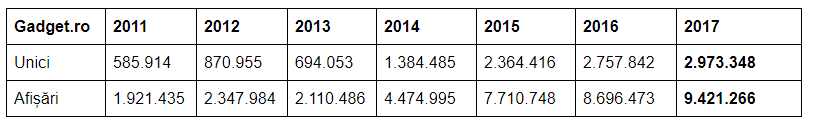 Putem spune că avem o stabilizare pe întreg anul și doar o ușoară creștere a traficului înregistrat. Pe ultimele trei luni din 2017 au fost înregistrate date mult mai bune față de aceeași perioadă din 2016 (1.043.689 unici față de 800.804 – creștere de 30.33% și 2.926.152 afișări vs 2.320.056 afișări – creștere de 26.12%).