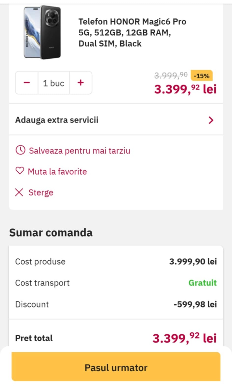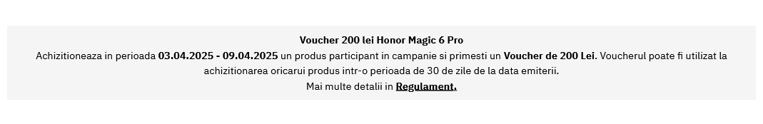 Acest telefon este Honor Magic6 Pro, cel care primeşte o reducere de 15% în aplicaţia mobile a celor de la Altex prin aplicarea codului cupon APP15PHONES. Preţul standard este de 3999.90 lei, iar prin aplicarea codului vei plăti un preţ final de 3399.92 lei. Transportul este gratuit.