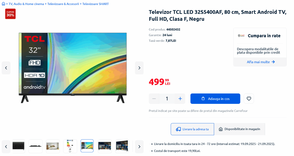 Din această campanie am ales modelul TCL LED 32S5400AF, un smart tv de 80 cm cu rezoluţie FullHD, sunet Dolby Audio şi Android TV. El costă standard 499.99 lei, sumă la care veţi primi un voucher de 150 lei. Dacă scădem acest voucher, rezultă că preţul final de achiziţie al televizorului va fi de 350 lei*.
