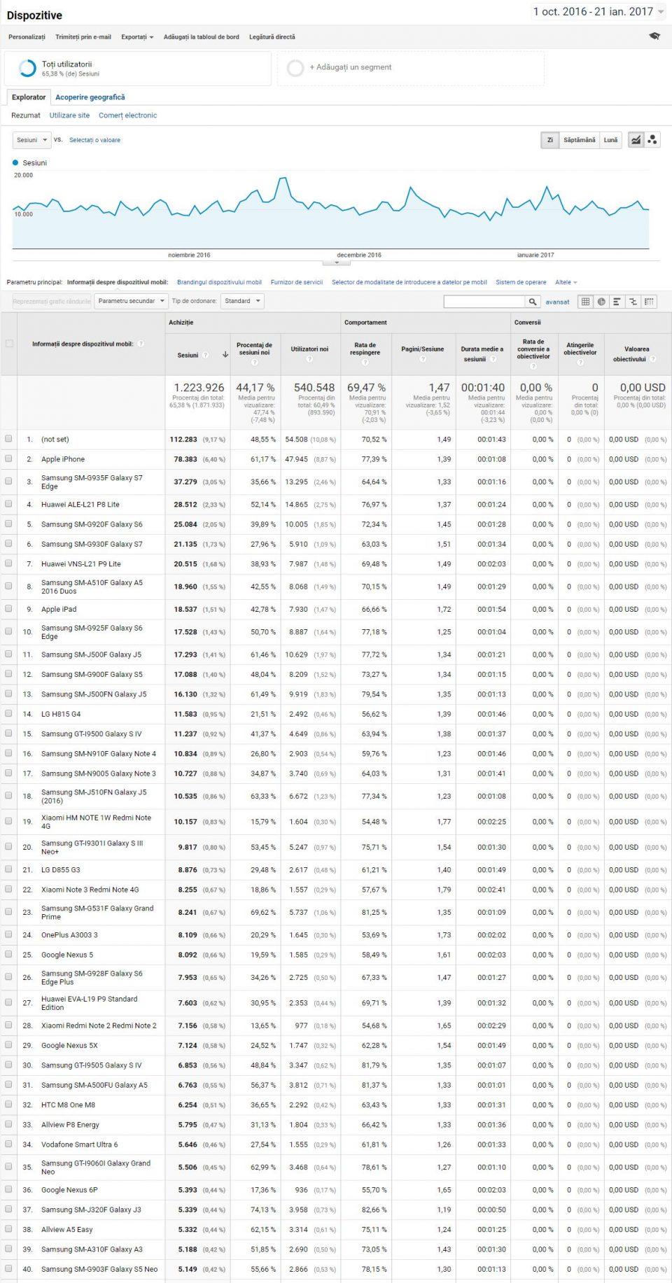 Am selectat perioada 1 octombrie 2016 – 21 ianuarie 2017 și cele 1.2 milioane de afișări realizate de pe dispozitive mobile erau împărțite după cum urmează: