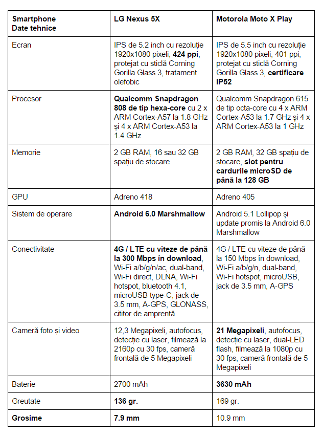 Moto X Play cu 32 GB spațiu de stocare și slot pentru cardurile microSD de până la 128 GB – 429 euro. Are un plus de rezistență la contactul cu apa, certificare IP52 și dacă nu mă înșel aduce două difuzoare frontale, sound mai bun decât LG Nexus 5X, cel puțin la nivel teoretic.