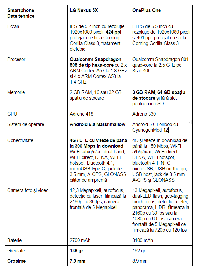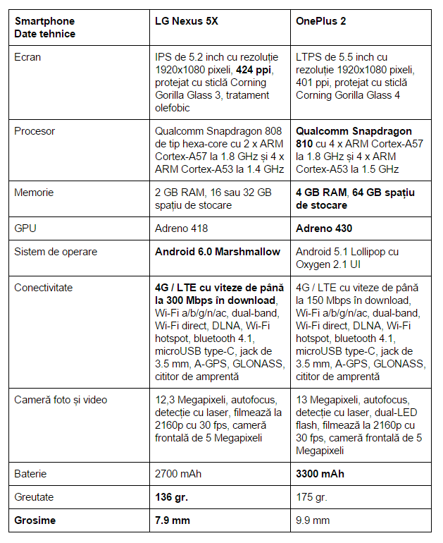 Și mai jos vedeți care sunt avantajele clare ale lui OnePlus 2 în fața lui LG Nexus 5X:
