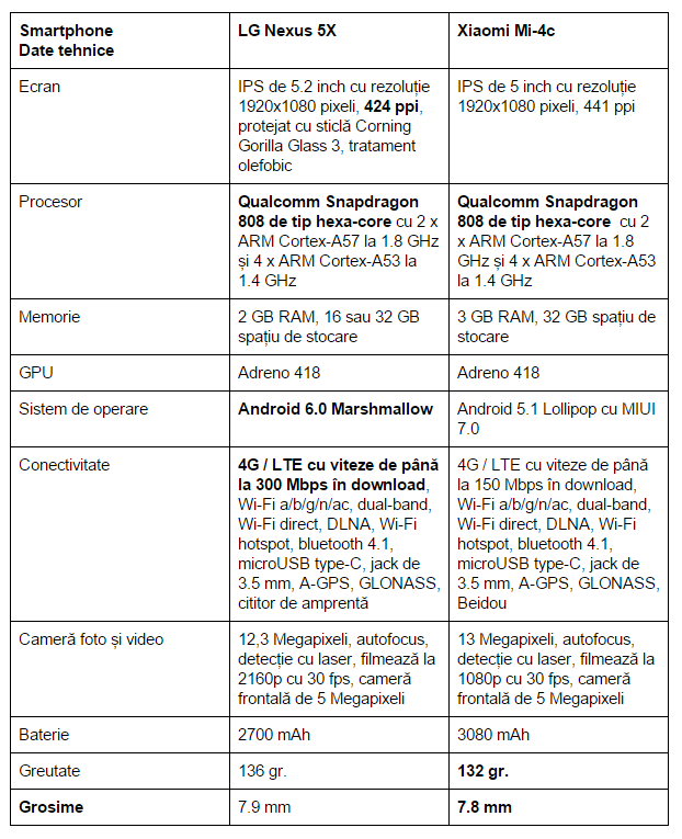 Pe de altă parte, Xiaomi Mi-4c are fix același procesor și accelerator grafic cu LG Nexus 5X.
